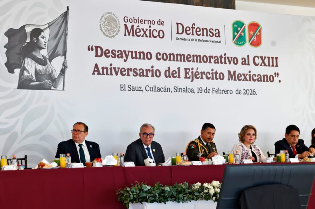El Sauz, Culiacán, Sinaloa, a 19 de febrero de 2026.- Conmemorando el CXIII aniversario del Ejército Mexicano, el Gobernador Rubén Rocha Moya, como invitado de honor, acompañó al comandante de la Tercera Región Militar Héctor Ávila Alcocer y al comandante de la Novena Zona Militar, Santos Gerardo Soto, así como personal castrense y de tropa, donde destacó su valiosa contribución en beneficio de la sociedad sinaloense.