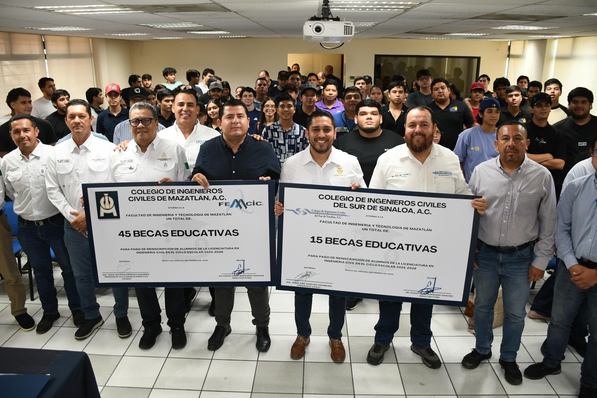 En una exitosa muestra de vinculación y responsabilidad social, la Universidad Autónoma de Sinaloa (UAS), a través de su Facultad de Ingeniería y Tecnología de Mazatlán (FITEM), en conjunto con el Colegio de Ingenieros Civiles de Mazatlán, A.C. y el Colegio de Ingenieros Civiles del Sur de Sinaloa, A.C., formalizaron la entrega de 60 becas de reinscripción a estudiantes de la carrera de Ingeniería Civil.