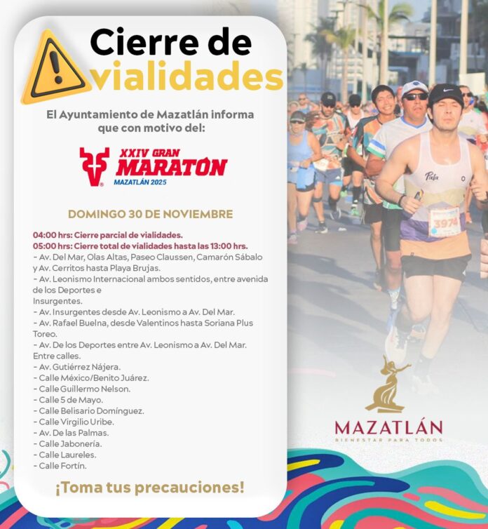 Para la libre realización del tradicional Maratón Chevron 2025, la Secretaría de Seguridad Pública Municipal y la Subdirección de Tránsito, dieron a conocer las vialidades que tendrán cierre total de la circulación a partir de las primeras horas de este domingo 30 de noviembre.