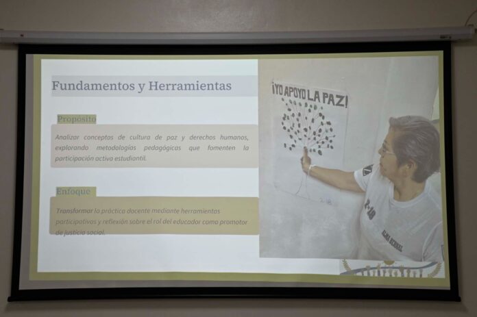 Con el firme objetivo de fortalecer el tejido social desde las aulas, la Universidad Autónoma de Sinaloa (UAS), a través de la Unidad de Bienestar Universitario (UBU), llevó a cabo el taller para docentes “Diseño de Productos de Participación Estudiantil en Cultura de Paz y Derechos Humanos”, impartido por la doctora Alma Luz Bernal, Juez Mediadora de Paz Internacional.