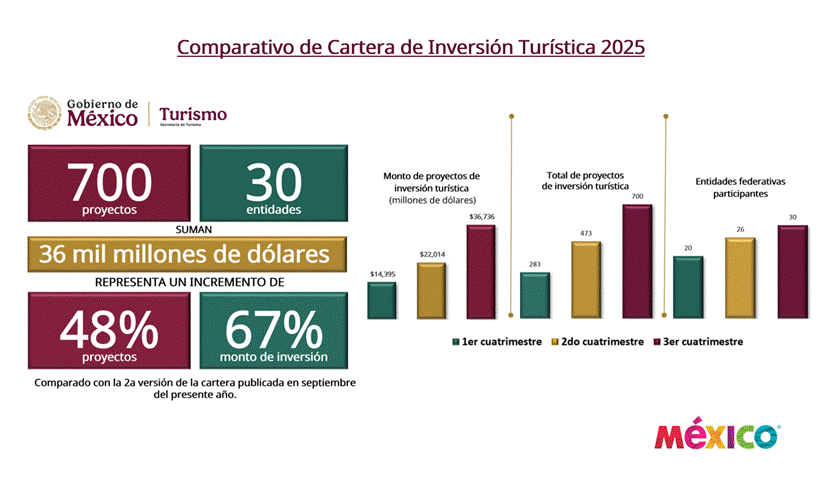 La Cartera de Inversión Turística 2025 cerró el año con 700 proyectos activos en 30 entidades federativas, los cuales representan una inversión conjunta de 36 mil 735 millones de dólares (mdd).