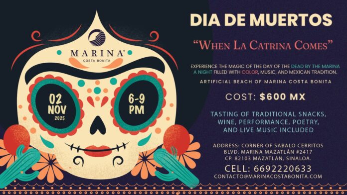 Este 2 de noviembre, de 6 a 9 p.m., Marina Costa Bonita te invita a vivir una noche mágica frente al mar, llena de color, música y tradición mexicana. Un evento único para celebrar el Día de Muertos en un escenario incomparable: la playa artificial de Marina Costa Bonita, ubicada en la zona de Cerritos, Mazatlán.