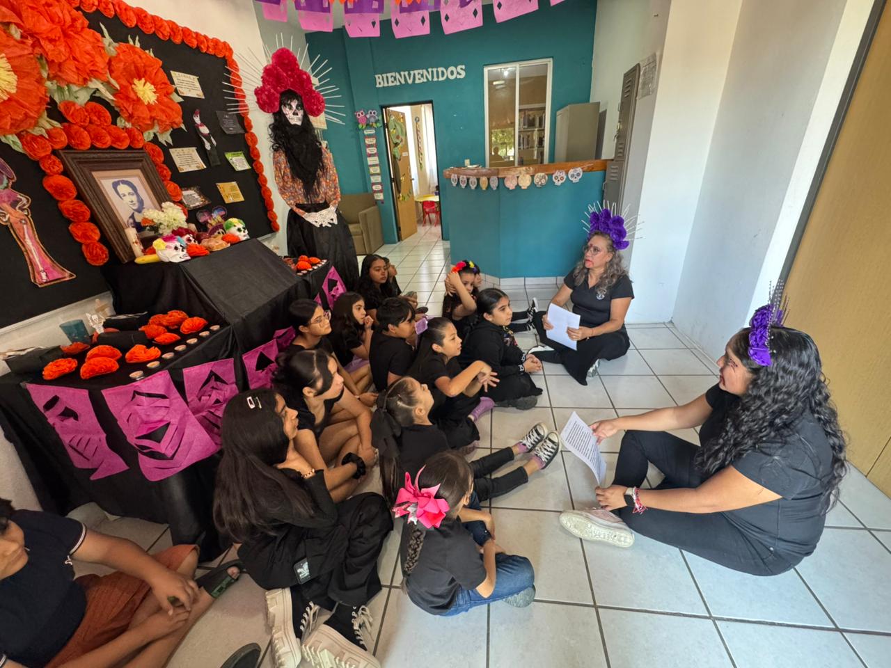 Con paciencia y dedicación Paola y Gabriela compartieron la historia de Carlos y Rosa para explicar a los pequeños el significado de cada elemento en el altar de muertos, enfatizando que la muerte es parte del ciclo de la vida y el amor perdura.