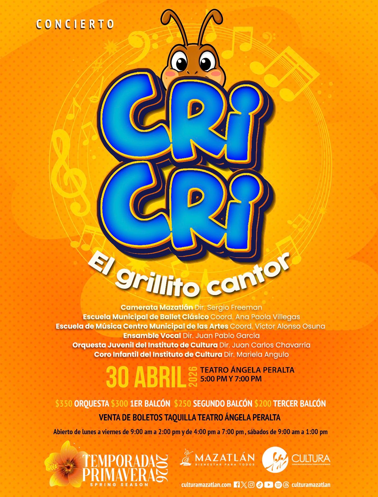 El Instituto Municipal de Cultura, Turismo y Arte de Mazatlán invita a las familias mazatlecas a disfrutar de este espectáculo lleno de alegría, imaginación y música que rinde homenaje a uno de los compositores más queridos de la música infantil en México. “Cri Cri, el grillito cantor” promete una experiencia escénica inolvidable que hará cantar, recordar y soñar a públicos de todas las edades.
