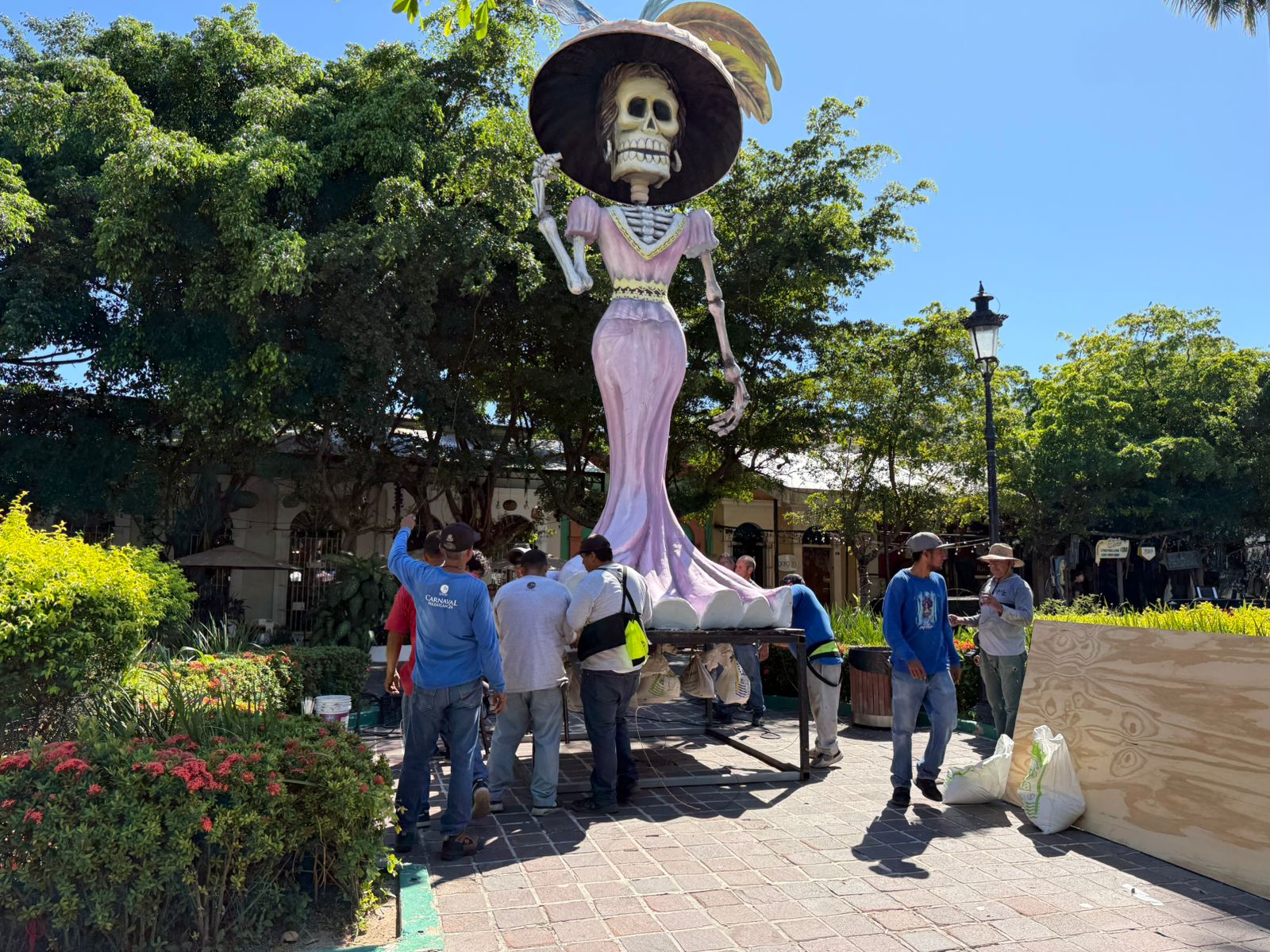 Desde las primeras horas del día, decenas de trabajadores del Instituto de Cultura, Turismo y Arte de Mazatlán se despliegan como un verdadero ejército de hombres comprometidos con el arte, el patrimonio y la belleza del puerto. Con herramientas, flores, estructuras y una entrega silenciosa, comienzan a vestir y embellecer la plazuela con catrinas monumentales, altares, velas y flores de cempasúchil que pronto iluminarán la noche mazatleca. 🌺💀