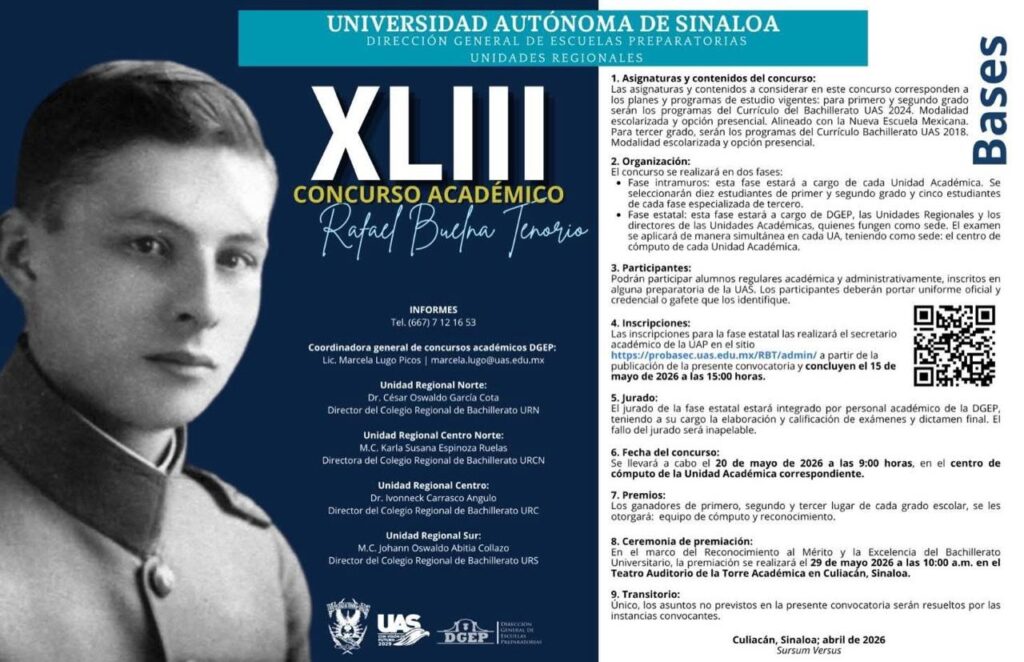 La Dirección General de Escuelas Preparatorias (DGEP) de la Universidad Autónoma de Sinaloa (UAS) convoca a todos los estudiantes de nivel medio superior a participar en la edición número 43 del icónico concurso académico Rafael Buelna Tenorio. Para esta ocasión, se espera la competencia de mil 500 jóvenes el próximo 20 de mayo, informó Damián Rendón Toledo.