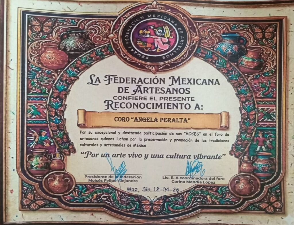 Al finalizar el Coro Ángela Peralta recibió un reconocimiento de la Federación Mexicana de Artesanos, por su destacada actuación en el foro que lucha por la preservación y promoción de las tradiciones culturales y artesanales de México.