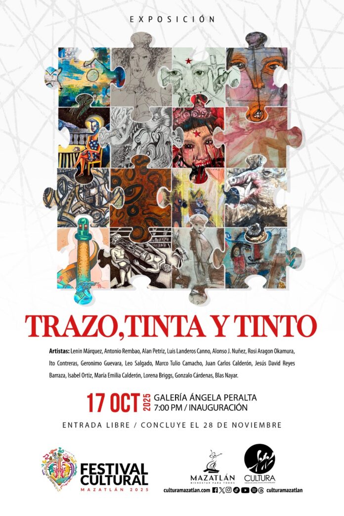El Instituto Municipal de Cultura, Turismo y Arte de Mazatlán invita a admirar «Trazo, Tinta y Tinto», una cautivadora exposición que celebra 30 años de arte sinaloense, creatividad y amistad. La inauguración será este viernes 17 de octubre a las 7:00 p.m. en la Galería Ángela Peralta y permanecerá abierta al público hasta el 28 de noviembre. ¡Entrada libre!.