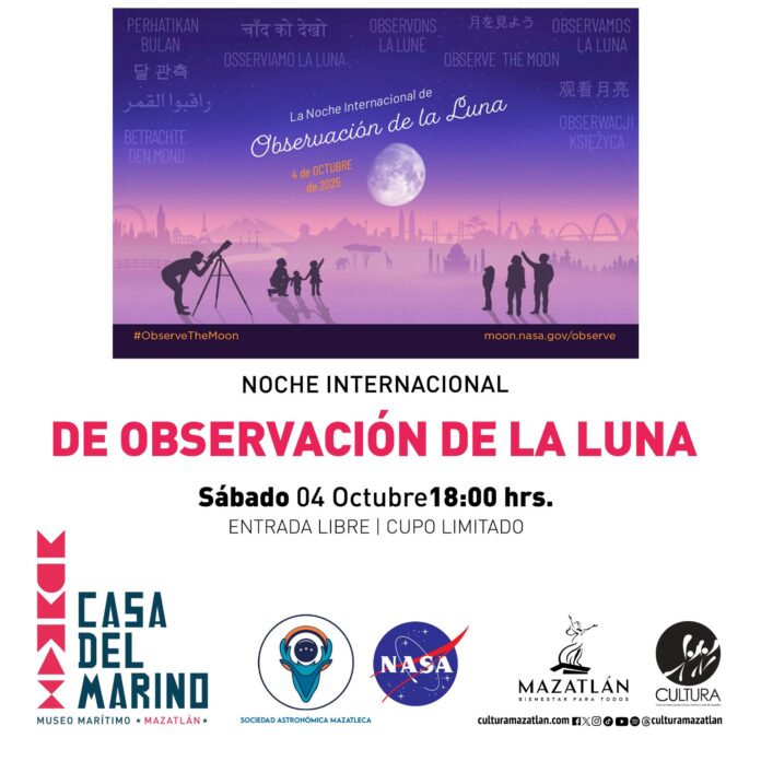 El Gobierno de Mazatlán, el Instituto Municipal de Cultura, Turismo y Arte y la Sociedad Astronómica de Mazatlán invitan a participar en la Noche Internacional de Observación de la Luna, un evento de talla mundial organizado por la NASA, con el objetivo de acercar a la población al conocimiento y la belleza de nuestro satélite natural.