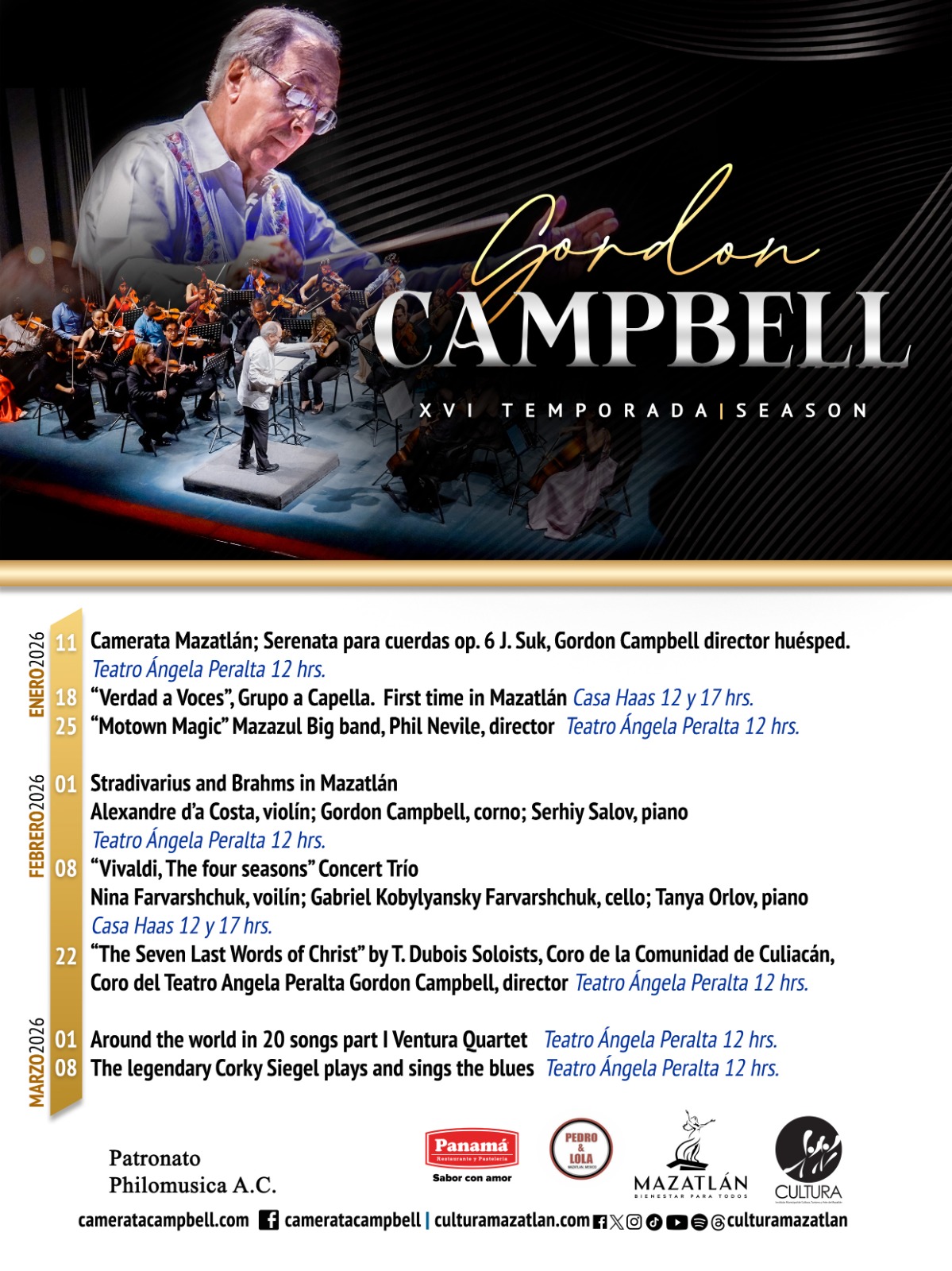 Boletos para los conciertos $400.00 y $200.00 a la venta en la taquilla del Teatro Ángela Peralta. Tel: 669 982 44 44 ext. 103.