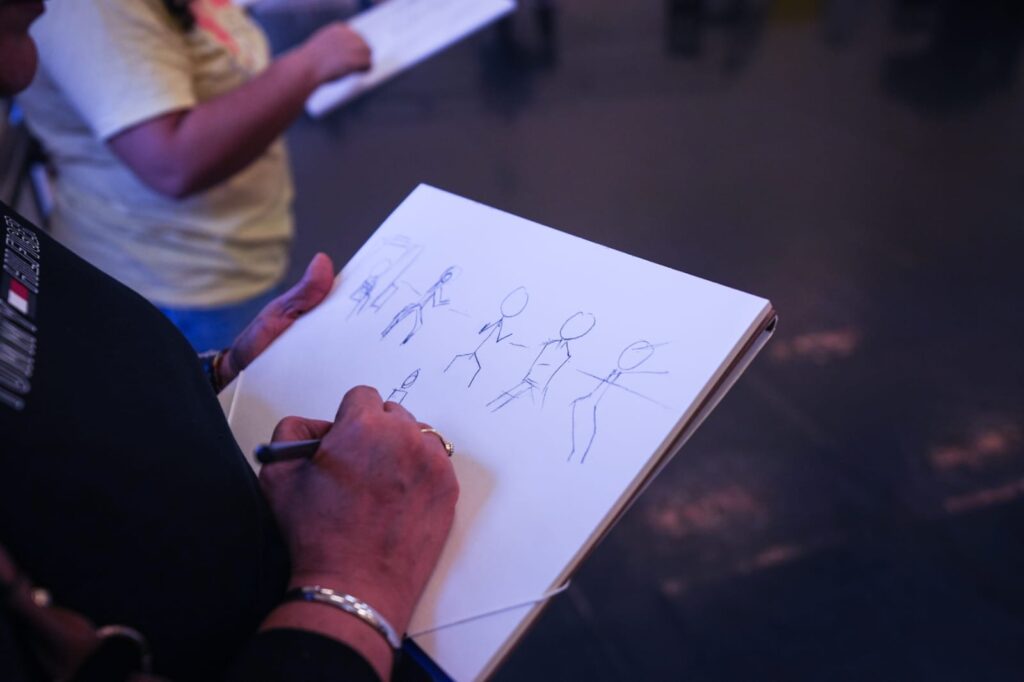 “El primer paso es captar el movimiento”, explicó el maestro. Para lograrlo, los estudiantes deben “congelar mentalmente” la acción del cuerpo, observar el gesto de la bailarina y realizar un trazo inicial o garabato gestual, una línea rápida que contiene la dinámica del movimiento. Posteriormente, ese trazo se transforma en una figura más estructurada, añadiendo huesos, músculos y proporciones.