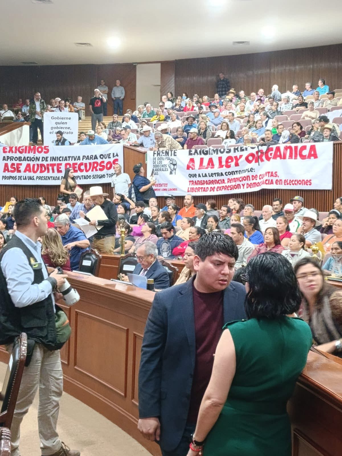 Jubilados “revientan” sesión del Congreso. La manifestación afuera del recinto legislativo de Culiacán subió de tono. Jubilados de la UAS penetraron a las instalaciones del Congreso del Estado que se encontraban en plena sesión. Se reportaron destrozos, puertas derribadas y tomaron la tribuna. Esto provocó que la sesión fuera suspendida. Luego se conoció que para continuar se declaro un cambio de lugar.
