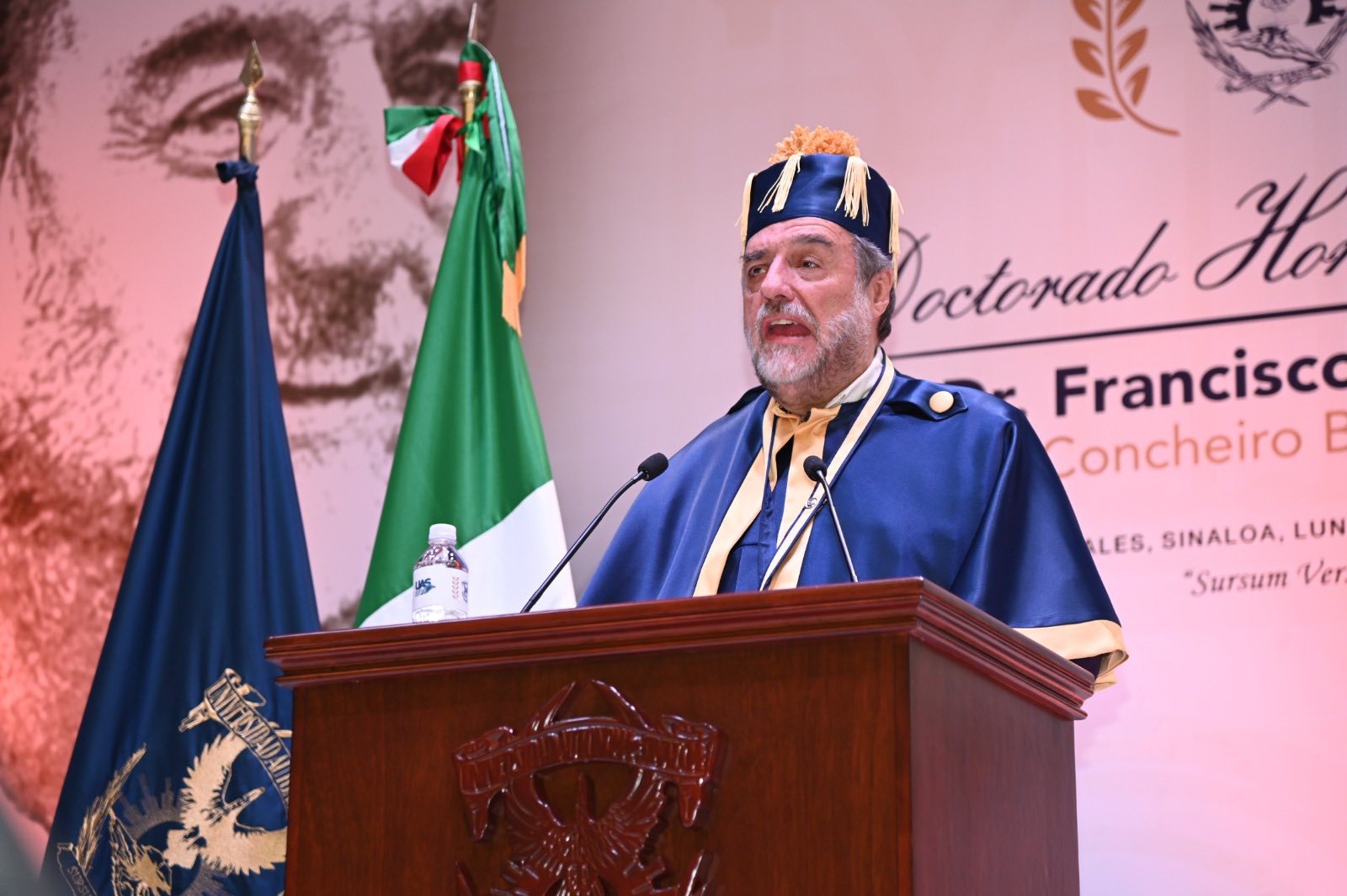 En representación del Gobernador del Estado, doctor Rubén Rocha Moya, asistió la Secretaria General de Gobierno, licenciada Yeraldine Bonilla Valverde, y como testigo de honor el Secretario General Ejecutivo de la Asociación Nacional de Universidades e Instituciones de Educación Superior (ANUIES), doctor Armando González Plasencia, ante quienes el Rector colocó en los hombros del homenajeado como parte de la investidura la muceta símbolo del honor, la sabiduría y la autoridad académica que acompaña a quien recibe esta máxima distinción, así como la medalla y el escudo de esta Casa Rosalina e impuso el birrete emblema del saber y pensamiento crítico.