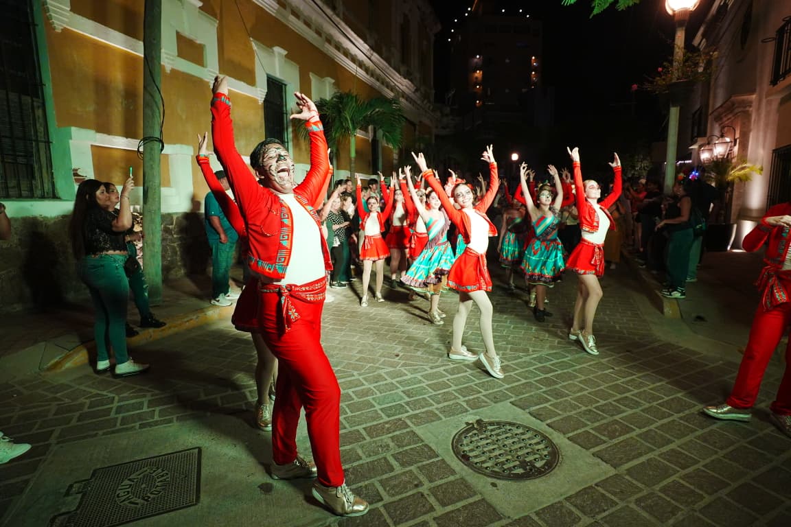 La banda sonora de la noche fue la inconfundible y poderosa música de tambora, que resonó con gran fuerza, haciendo vibrar las calles e invitando a bailar a los miles de asistentes. Los jóvenes de comparsas no dudaron en extender la invitación a los presentes para unirse al baile.