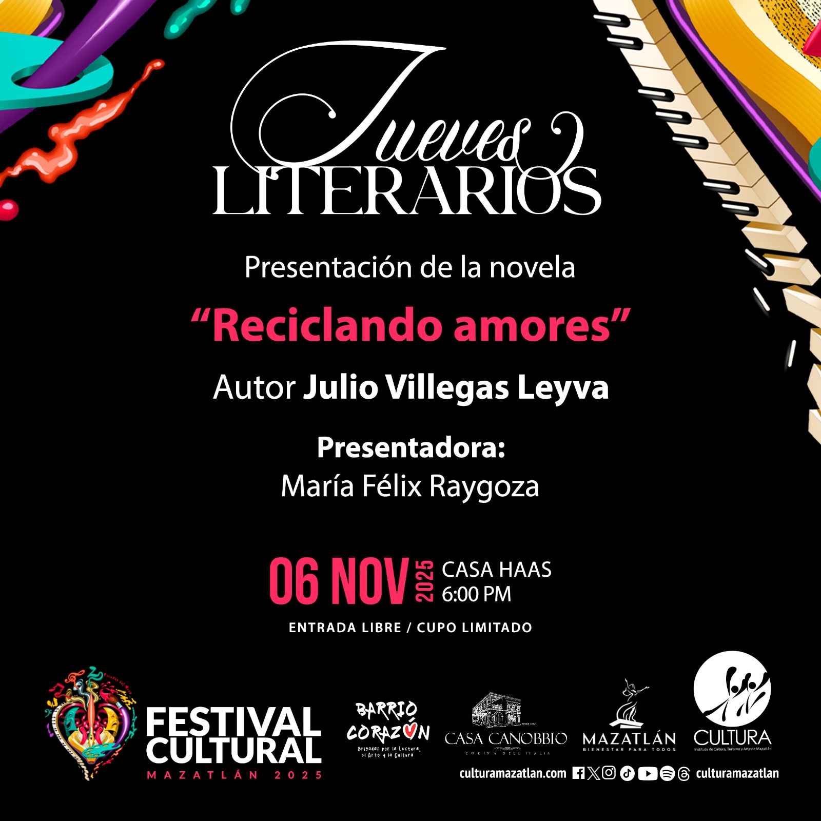 El programa «Jueves Literario» recibirá la más reciente producción del escritor Julio Villegas Leyva. Este jueves 06 de noviembre en punto de las 18:00 horas en la histórica Casa Haas, se llevará a cabo la presentación de su conmovedora obra, “Reciclando Amores”.