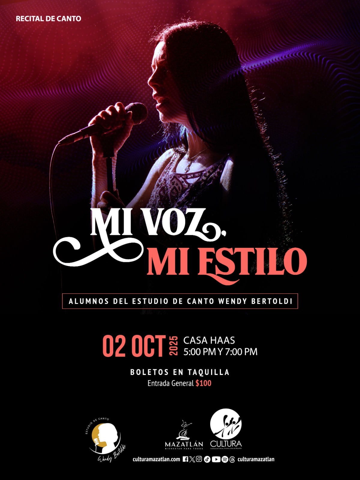 La escena cultural de Mazatlán se prepara para recibir nuevas voces, pues los integrantes del Estudio de Canto Bertoldi harán su esperado debut en el recital «Mi voz, mi estilo» este jueves 2 de octubre. Será una noche de emociones y talento donde muchos de estos jóvenes cantantes se enfrentarán por primera vez a un escenario, tras meses de intensa preparación vocal.