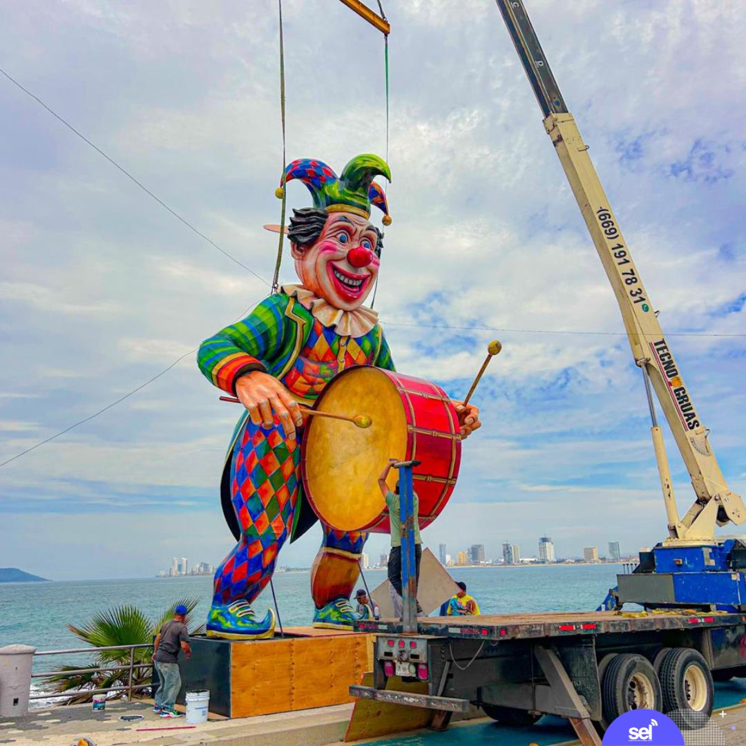 Esta mañana de lunes a primera hora se colocó en la Plazuela Machado la primera de estas grandes figuras: una sirena tocando una tuba y en el Parque Ciudades Hermanas un payaso arlequín con una tambora en sus manos; en Playa Norte, al inicio de la calle Belisario Domínguez, se instaló otro más y cerca de Valentinos, se puso la figura de un músico con sombrero y la clásica tambora sinaloense. Se estima que se pongan hasta 12 monigotes de hoy hasta el viernes.