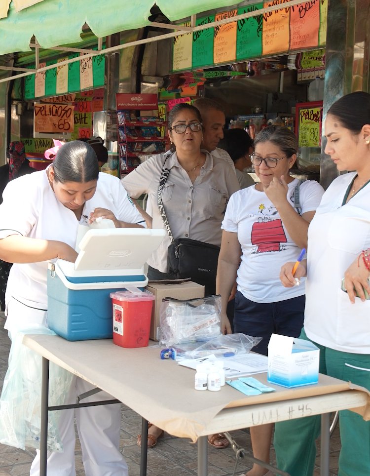 Después de la pandemia del Covid que mató a mucha gente en el mundo y en México, ahora las instituciones de salud tienen más cuidado de brotes de virus y realizan periódicamente campañas de salud con vacunación a la población en general. Esta mañana fue el caso de un grupo de enfermeras del IMSS, como Nayeli, que vacunaron a muchas personas de todas las edades en los alrededores del mercado Hidalgo, en la colonia Juárez.