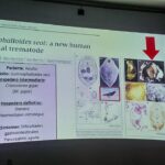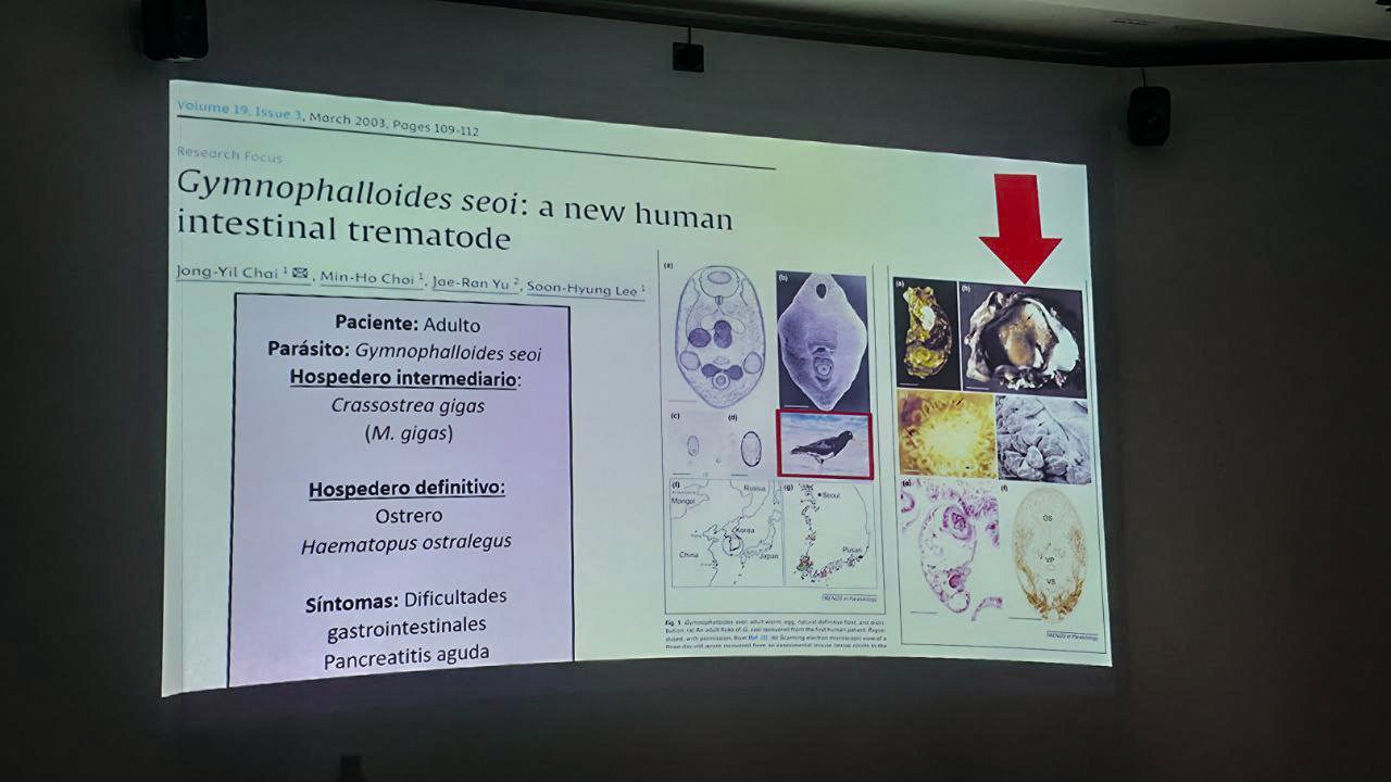 Por su parte, Guadalupe Zambrano abordó la clasificación, transmisión y las enfermedades zoonóticas, y destacó el impacto de los organismos «digenios» en moluscos y los casos registrados en humanos en países como Japón y Corea.