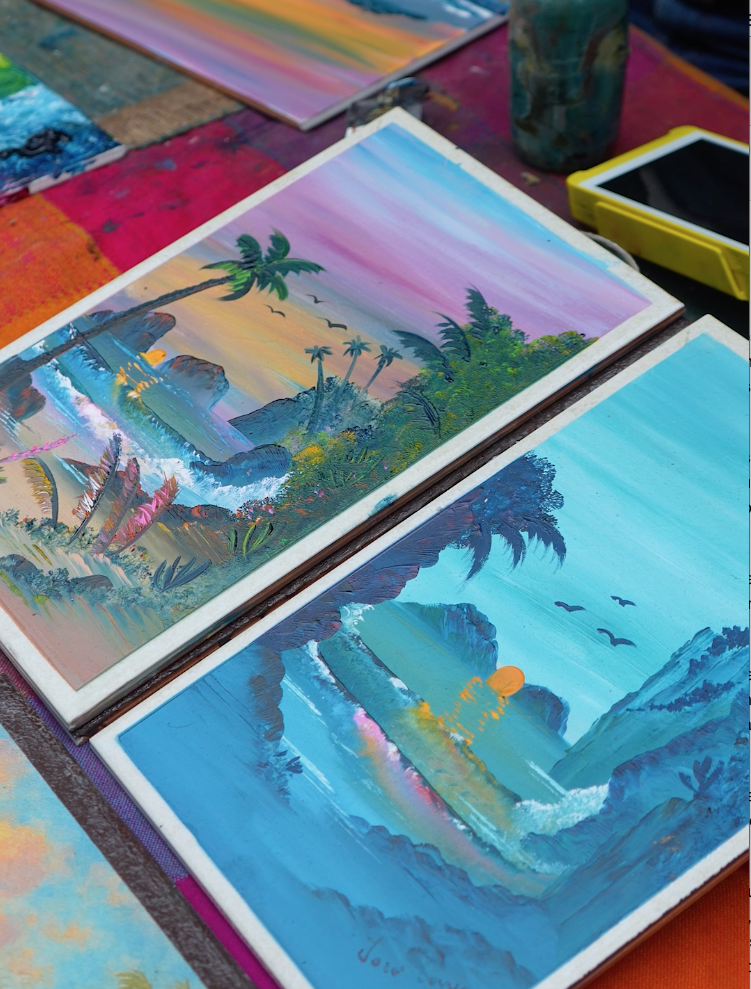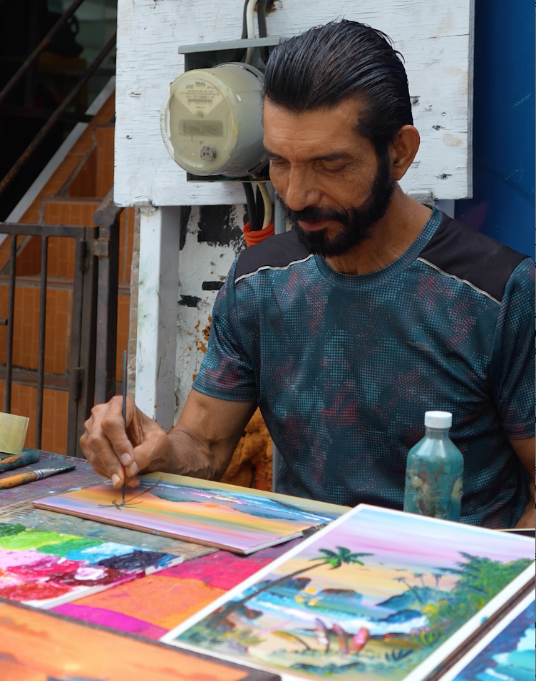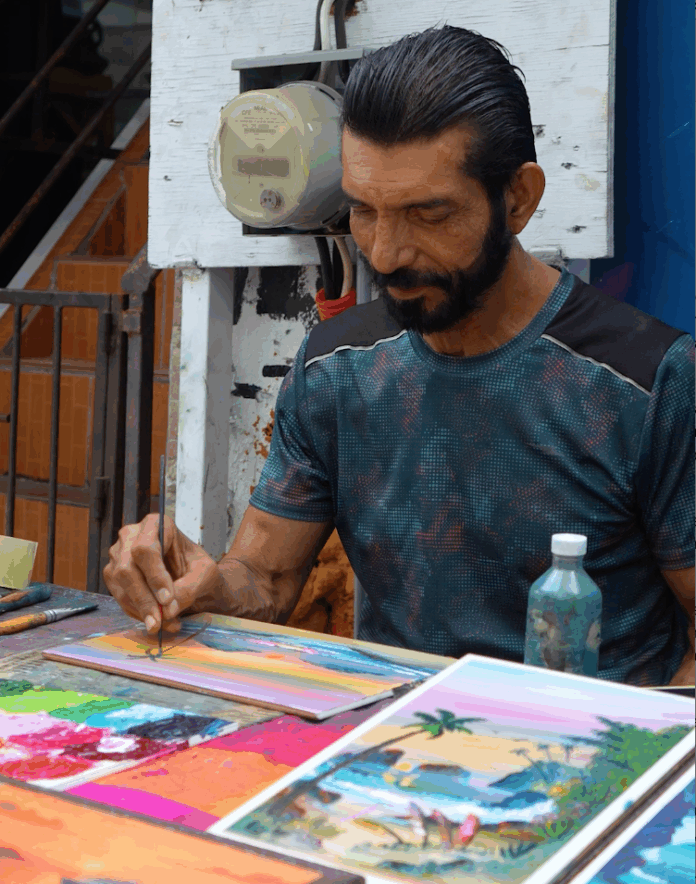 Vive de la venta de sus obras a los turistas, nacionales o extranjeros, pues tiene su humilde puesto ambulante en avenida Gaviotas, en la Zona Dorada, donde su esfuerzo puede ir de los 10 a los 20 minutos con los dedos para terminar un cuadro hasta tres horas con el pincel para un trabajo más especial que lo vende en buen precio.