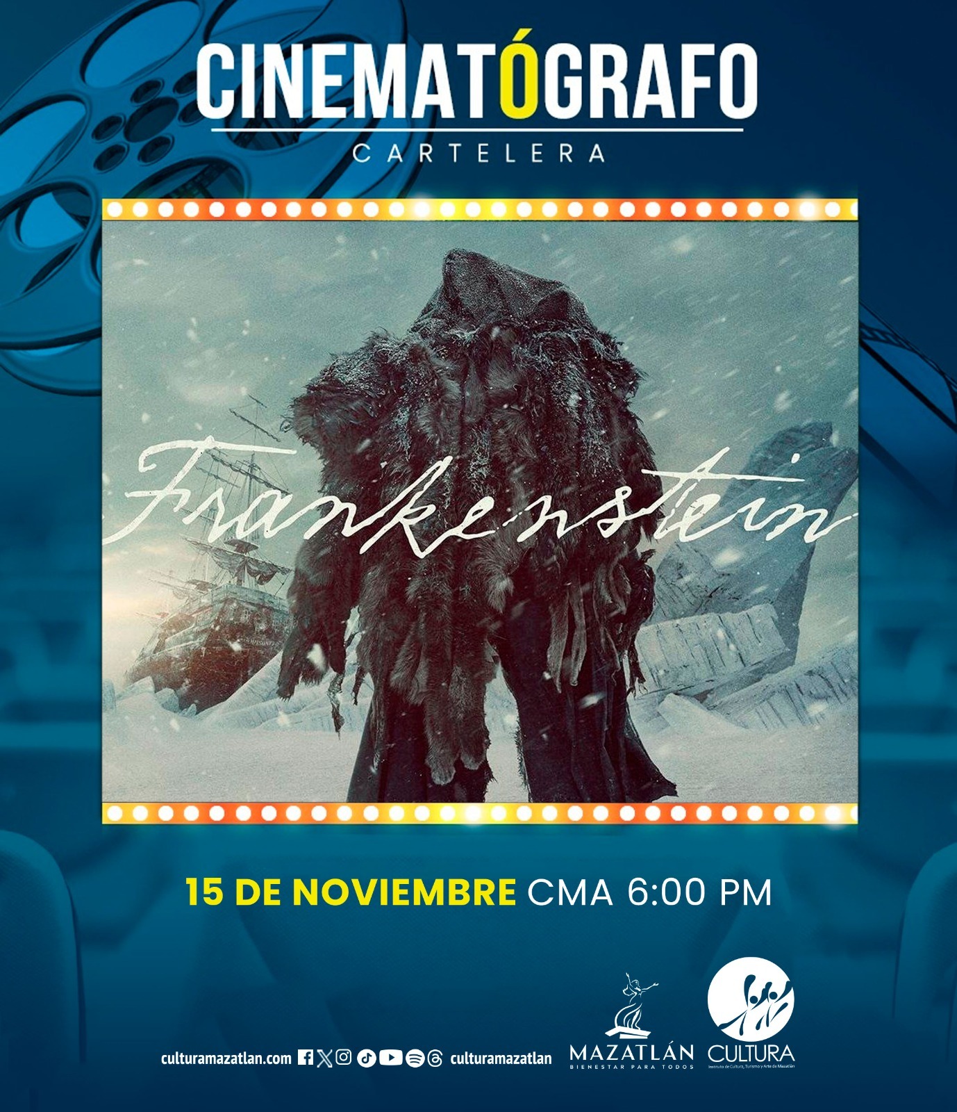 Mazatlán, Sinaloa, 14 de noviembre de 2025.- Este sábado 15 de noviembre de gala estará el Cinematógrafo “Marco Lugo” del Centro Municipal de las Artes, el motivo, se proyectará “Frankenstein”, considerada uno de los mejores largometrajes de este 2025, obra que marca el regreso del director Guillermo del Toro a su territorio más natural: la fábula gótica atravesada por el humanismo y la belleza del monstruo.
