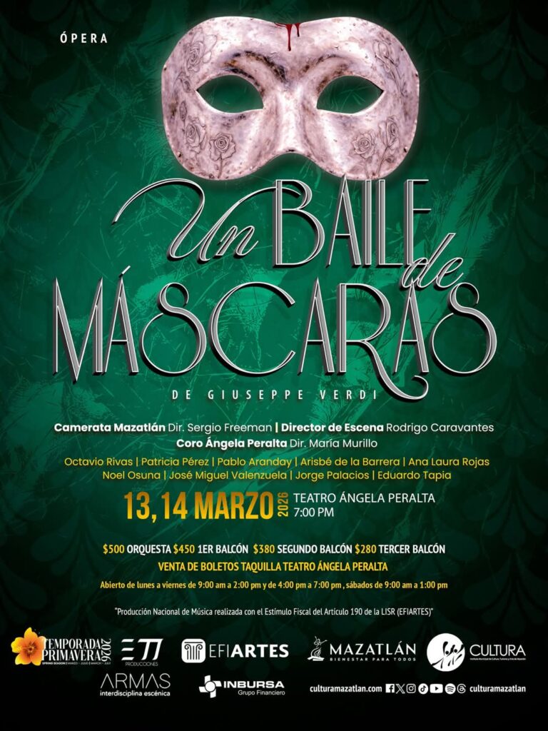 Bajo la dirección magistral del Mtro. Sergio Freeman, la Camerata Mazatlán afina los últimos detalles para presentar la ópera “Un baile de máscaras” (Un ballo in maschera), una de las obras más intensas y emocionantes de Giuseppe Verdi. La cita será este viernes 13 y sábado 14 de marzo a las 19:00 horas en el Teatro Ángela Peralta.