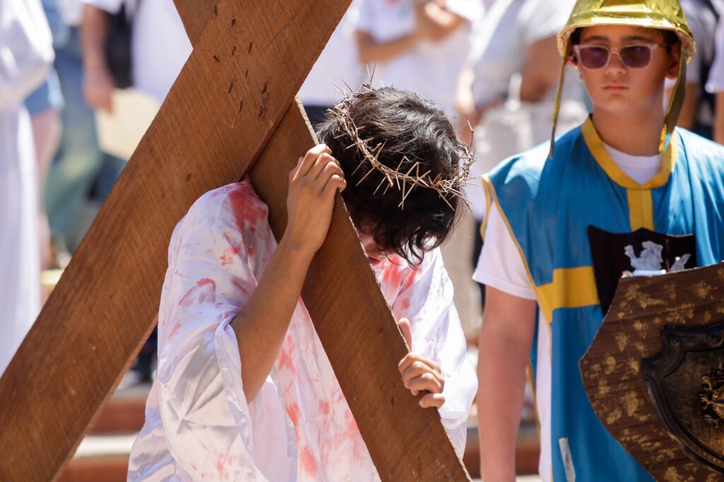 Después de la primera estación, Jesús inicia la carga de la cruz y luego en la segunda metros más adelante, cae por primera vez; en la tercera Jesús encuentra a su madre, María y así sucesivamente se va dando la celebración con: Simón de Cirene ayuda a llevar la cruz; Verónica limpia el rostro de Jesús; Jesús cae por segunda vez; Jesús consuela a las mujeres de Jerusalén y después viene la tercera caída.