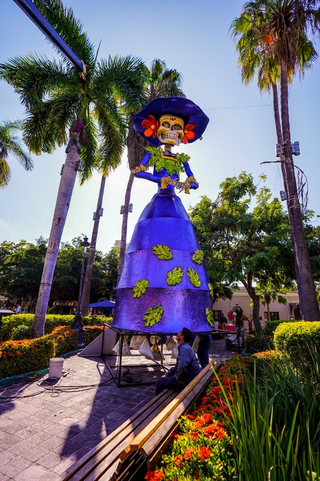 La escultura combina el uso de flores naturales, estructuras metálicas y una estética inspirada en la tradición mexicana de honrar a los difuntos, adaptada al lenguaje contemporáneo y festivo de las celebraciones mazatlecas.