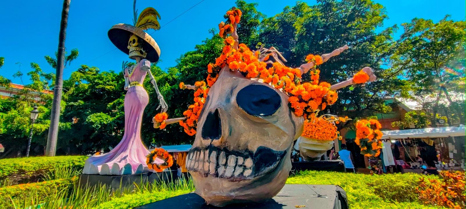 Además de la obra de “Momo” la Plazuela Machado se engalana para la celebración de Día de Muertos con una espectacular decoración que incluye una elegante catrina de menor escala y cráneos de papel de grandes dimensiones restaurados y pintados por talentosos alumnos y maestros de la Escuela de Artes Plásticas del Centro Municipal de las Artes (CMA), coordinada por la maestra Mónica Rice.
