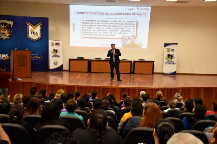 A través de cuatro ejes principales (enfermedades transmitidas por alimentos, vías de contaminación, conservación e higiene personal), el coordinador estatal del programa Vive Saludable, Vive Feliz de la COEPRISS, Oscar René Mascareño Gutiérrez, compartió las herramientas necesarias para minimizar riesgos de salud en la comunidad universitaria.