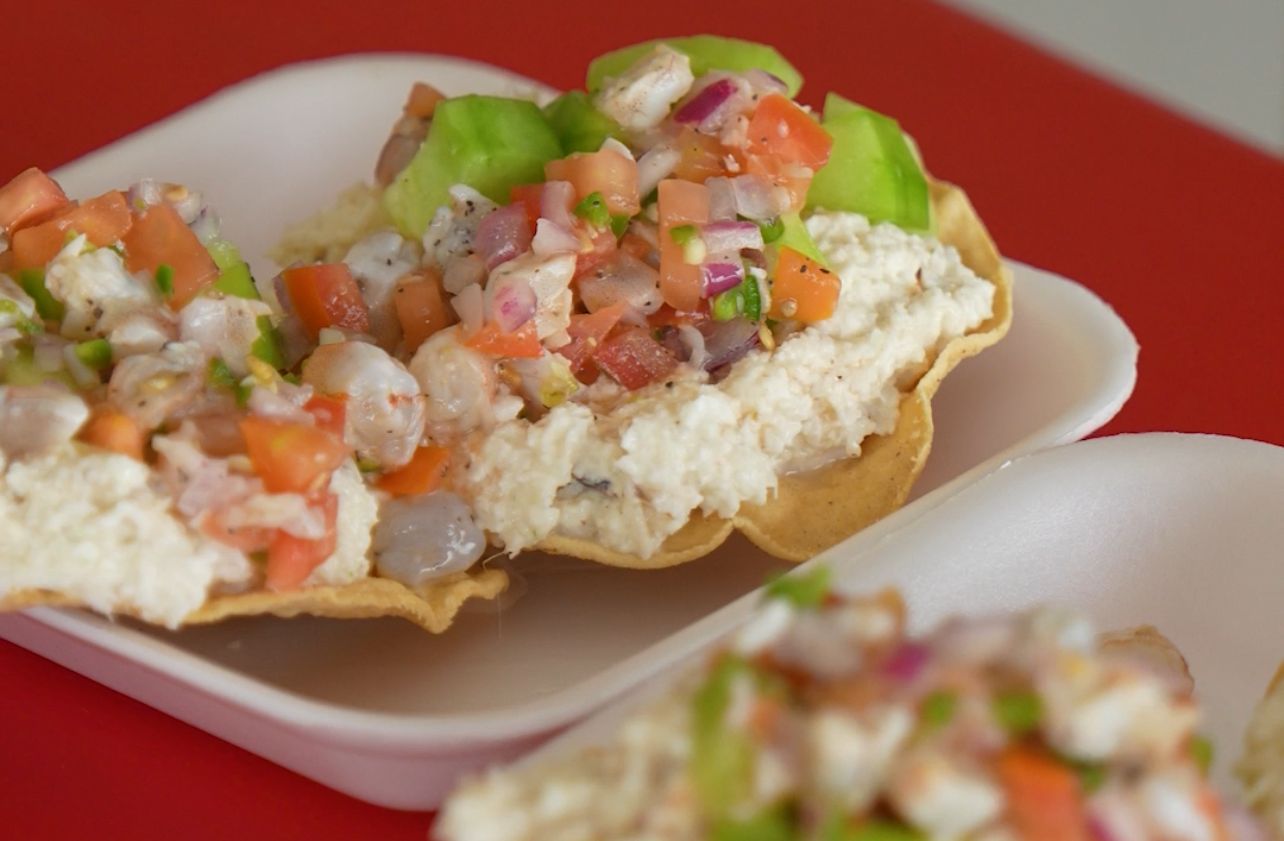 Dijo que sus tostadas se distinguen por servirse como un paté de jaiba acompañado de un toque cítrico de ceviche de camarón o cochito encima, todo por 28 pesos.