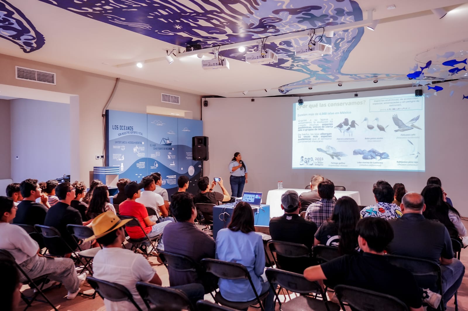 Mazatlán, Sinaloa, 10 de octubre de 2025.- La bióloga Bitia Berenice Vallín Hernández, enlace de la Comisión Nacional de Áreas Protegidas (CONANP) para la protección de la flora y la fauna en el Golfo de California y las costas de Sinaloa, ofreció una conferencia titulada «La importancia de las Islas de Mazatlán” como parte del programa «La Ciencia también es Cultura».