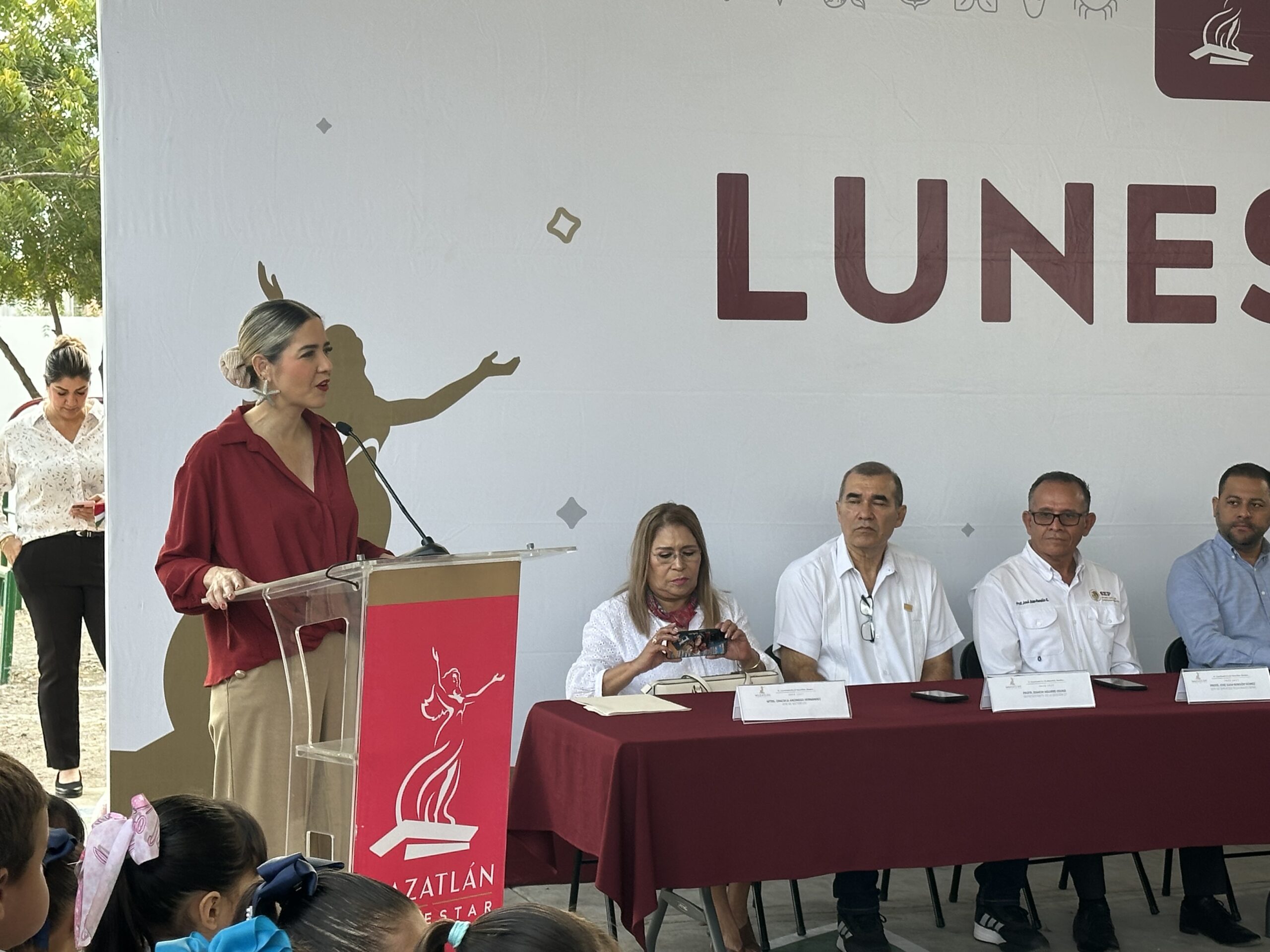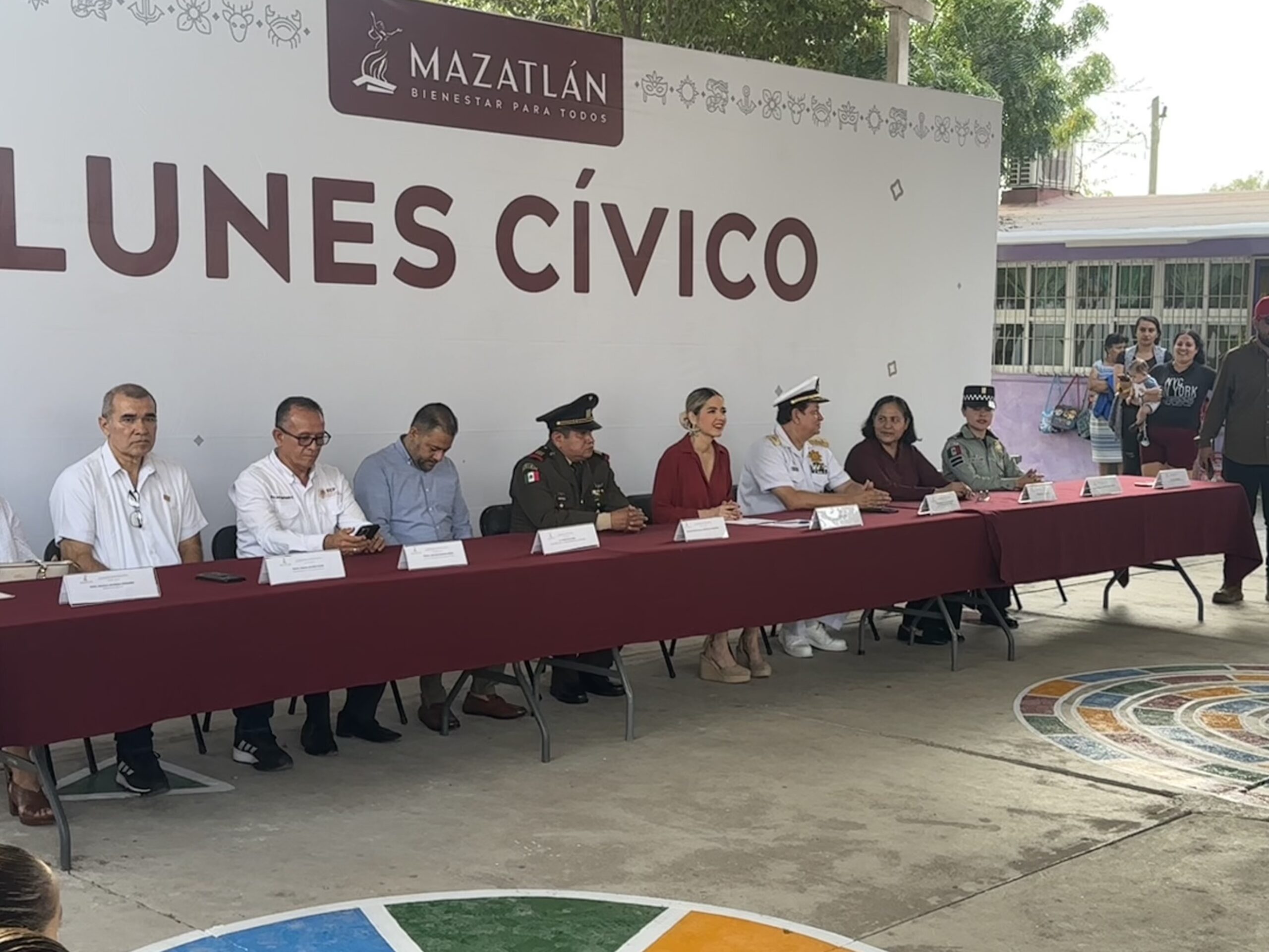 Durante el acto cívico, la alcaldesa de Mazatlán, Estrella Palacios, expresó su satisfacción por regresar a la institución para cumplir un compromiso previamente adquirido con directivos y padres de familia.