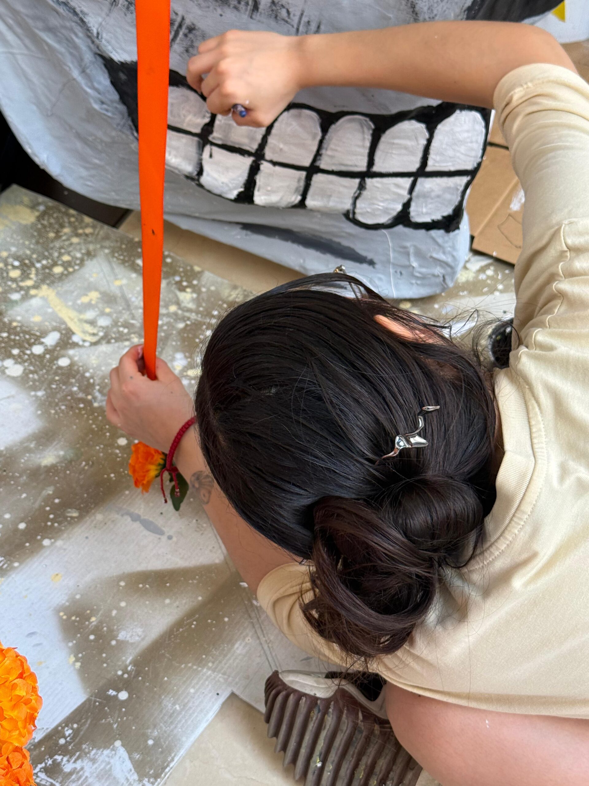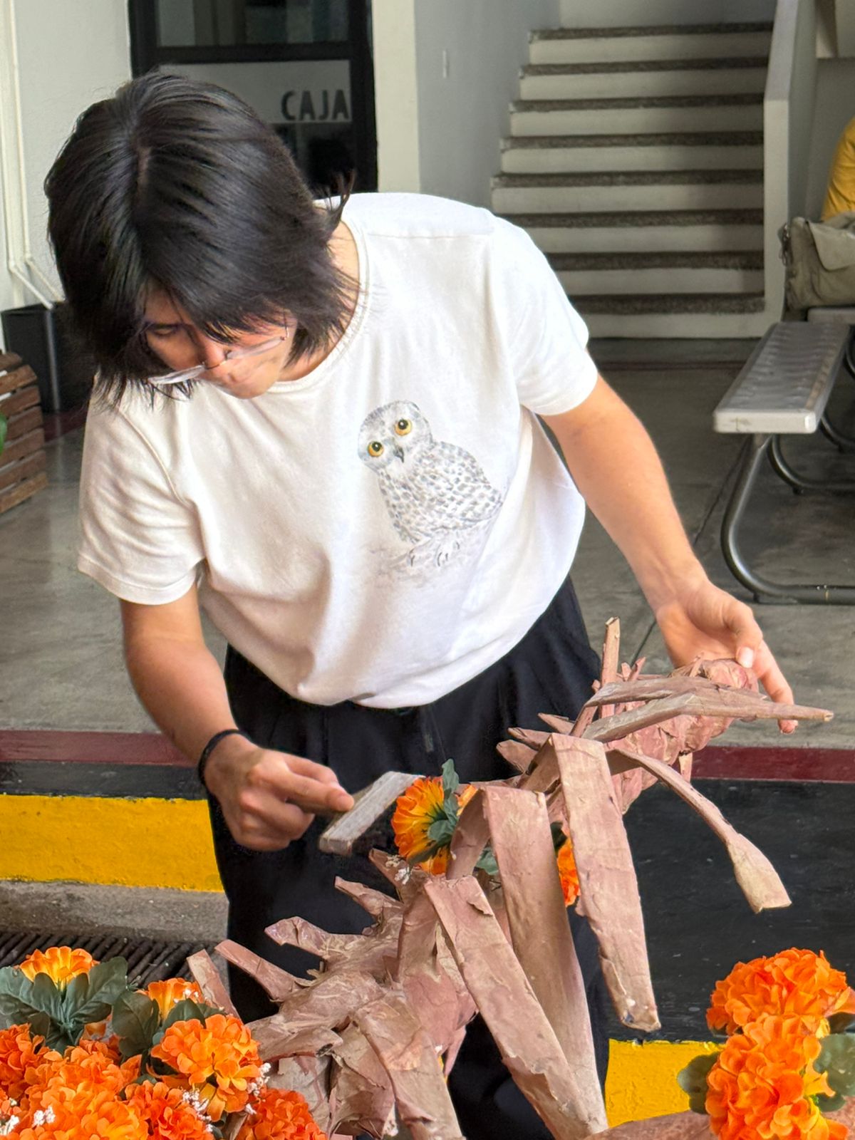 Entre los estudiantes participantes se encuentra Jasmine Liliana González Vázquez, alumna de tercer año, quien colaboró en la elaboración de tocados florales y ornamentación para las calaveras que se exhibirán en la plaza.
