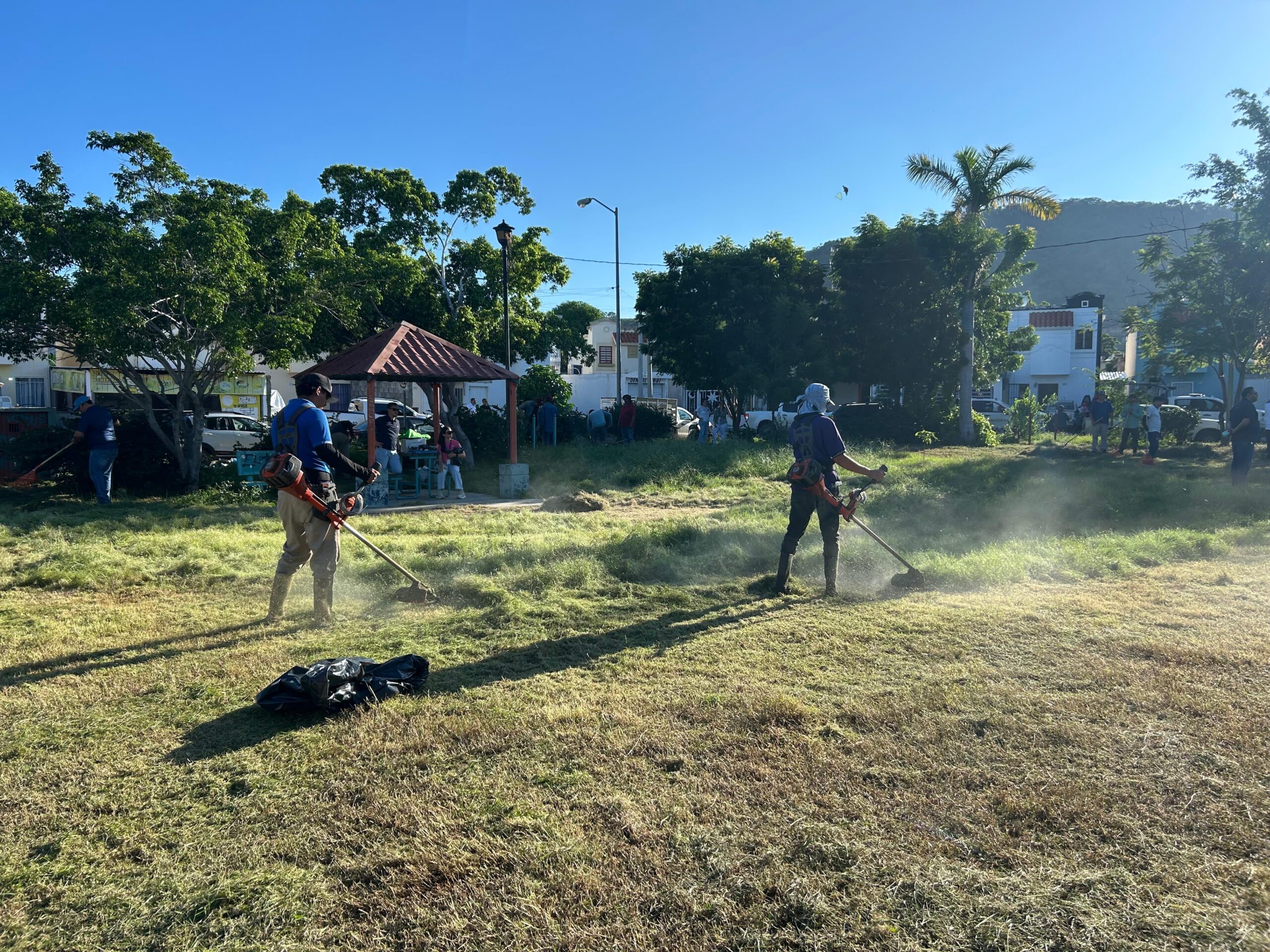 La alcaldesa Estrella Palacios Domínguez encabezó los trabajos de limpieza, embellecimiento y rehabilitación del parque, donde se realizan labores de recorte y poda de árboles, pintura, reparación de bancas y la instalación de nuevos juegos infantiles.