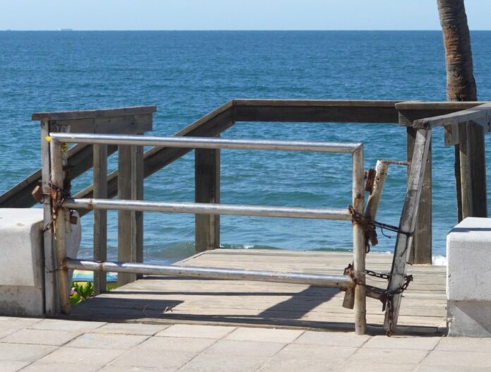 Una vez, las imágenes y fotografías revelan que en la ciudad no hay orden, pues además de que una palapa construye baños con azulejo blanco aprovechando la parte baja de la infraestructura municipal del Malecón, ahora hasta las puertas que frenan el paso de locales y turistas a las playas, son del viejo barandal inoxidable que se quitó del Paseo del Mar.