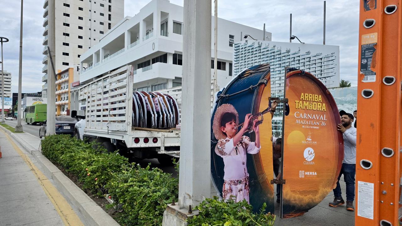 El ambiente carnavalero comienza a sentirse en el puerto. Desde las primeras horas de este sábado, el equipo de Operaciones del Instituto Municipal de Cultura, Turismo y Arte finalizó la instalación de la avanzada publicitaria del Carnaval Internacional Mazatlán 2026 con los pendones oficiales bajo el lema: “¡Arriba la Tambora!”.