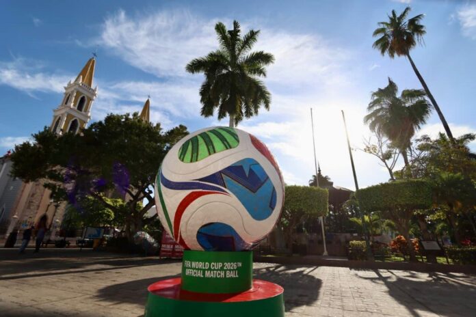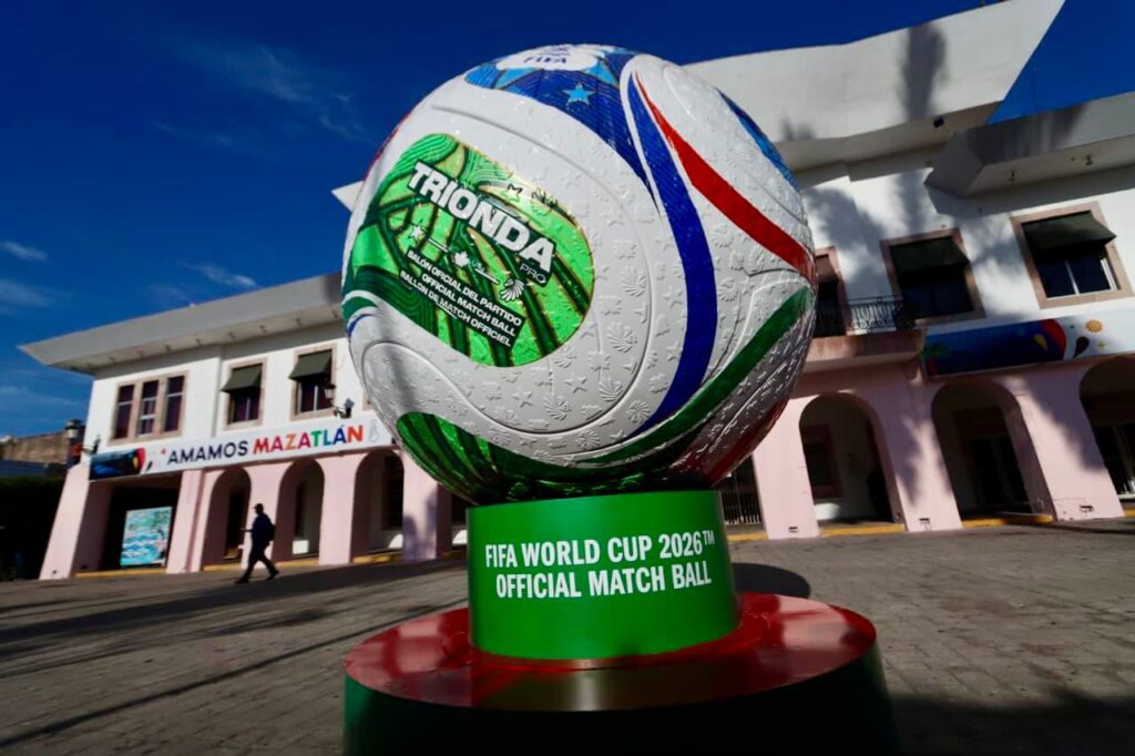 Trionda, el balón oficial del Mundial, está colocado como un parador oficial fotográfico en la explanada principal frente a Palacio Municipal de Mazatlán, de acuerdo con la empresa patrocinadora Deportenis.