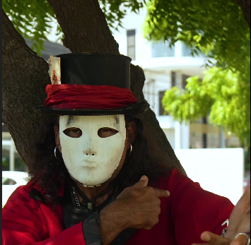 Ángel Bastos, quien se cubre la cara con una máscara parecida al “Fantasma de la Ópera, pero no para dar miedo sino porque es su caracterización de artista urbano que hace magia, entretiene a los conductores en los semáforos, pero también dice que participa en fiestas, reuniones y todo evento que quiera contratarlo. “Es un trabajo digno y prefiero esto que andar de ratero”, señala.