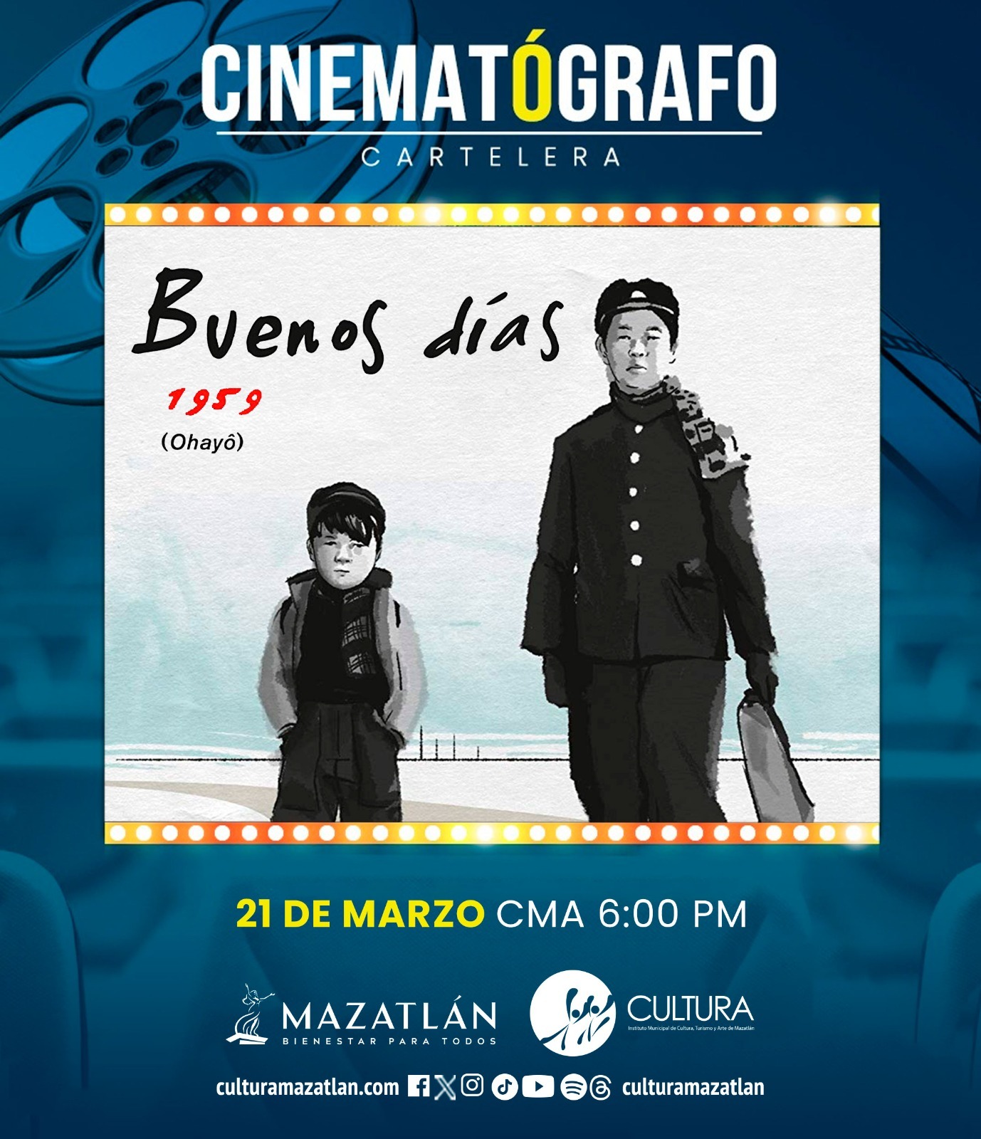 En el inicio de la primavera, este 21 de marzoa las 6 de la tarde llega a la sala del Cinematógrafo “Marco Lugo” del Centro Municipal de las Artes, la película japonesa Ohayō (Buenos días), estrenada en el año de 1959, obra del director Yasujirō Ozu, quien creo una de las mejores comedias del cine oriental, según la crítica internacional.