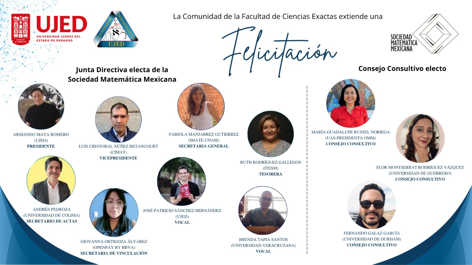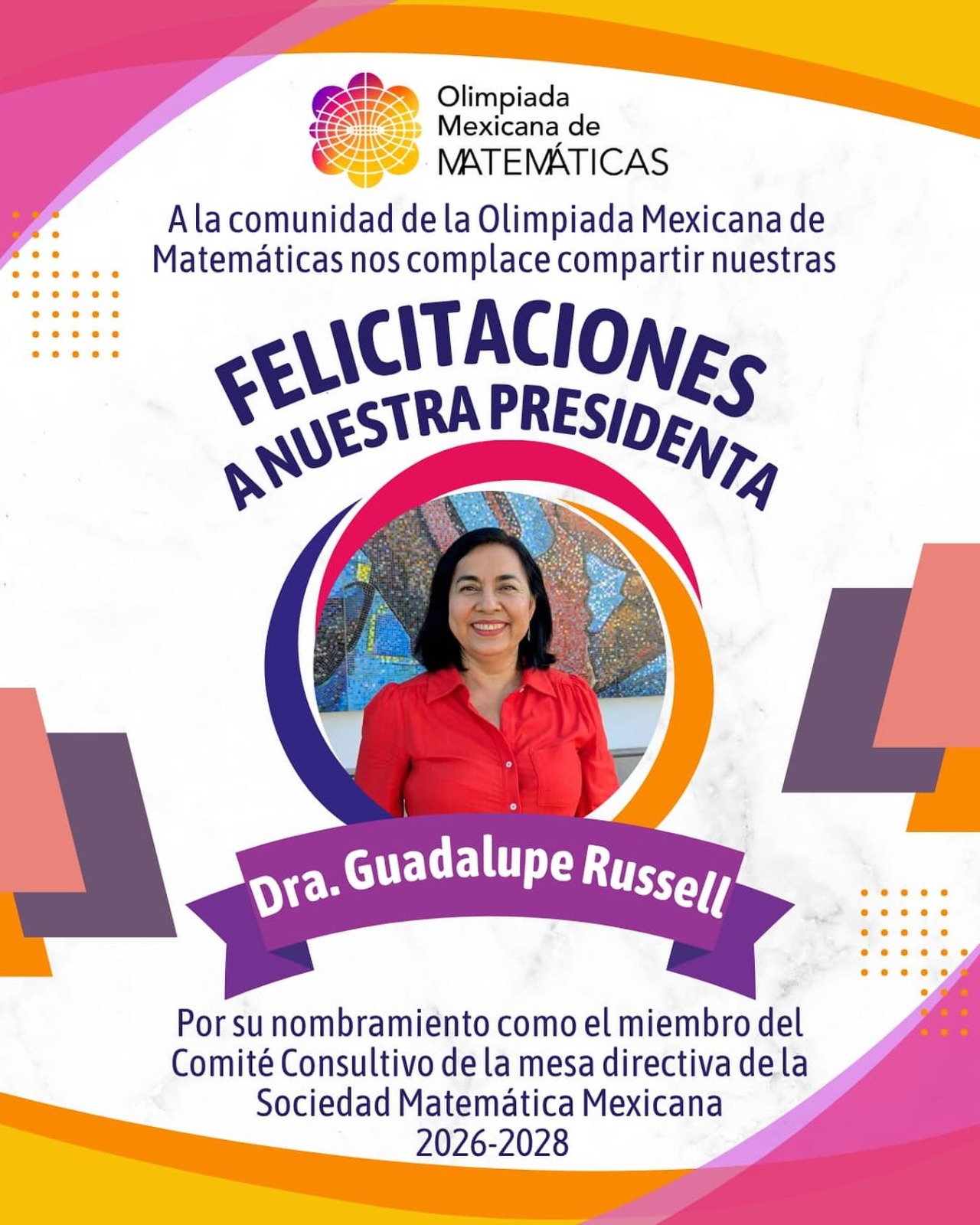 La Universidad Autónoma de Sinaloa (UAS) felicita a la investigadora de la Facultad de Ciencias Físico Matemáticas, Guadalupe Russell Noriega, por su reciente nombramiento como parte del Consejo Consultivo de la Nueva Asamblea de la Sociedad Matemática Mexicana 2026-2028, representado a la planilla llamada Enlace Matemático, quien consiguió la victoria en las pasadas elecciones.