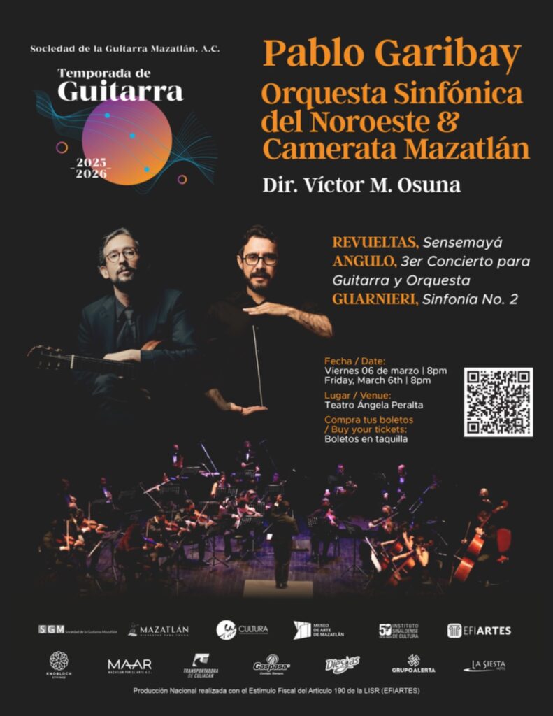 Asista al concierto de clausura de la Temporada de Guitarra 2025–2026 de la Sociedad de la Guitarra Mazatlán, A.C., en colaboración con el Instituto de Cultura, Turismo y Arte de Mazatlán y disfrute una velada musical con la presencia del guitarrista mexicano de renombre internacional Pablo Garibay, quien actuará como solista acompañado por la Orquesta Sinfónica del Noroeste y la Camerata Mazatlán que darán vida a un programa de gran riqueza estética y profundidad artística.