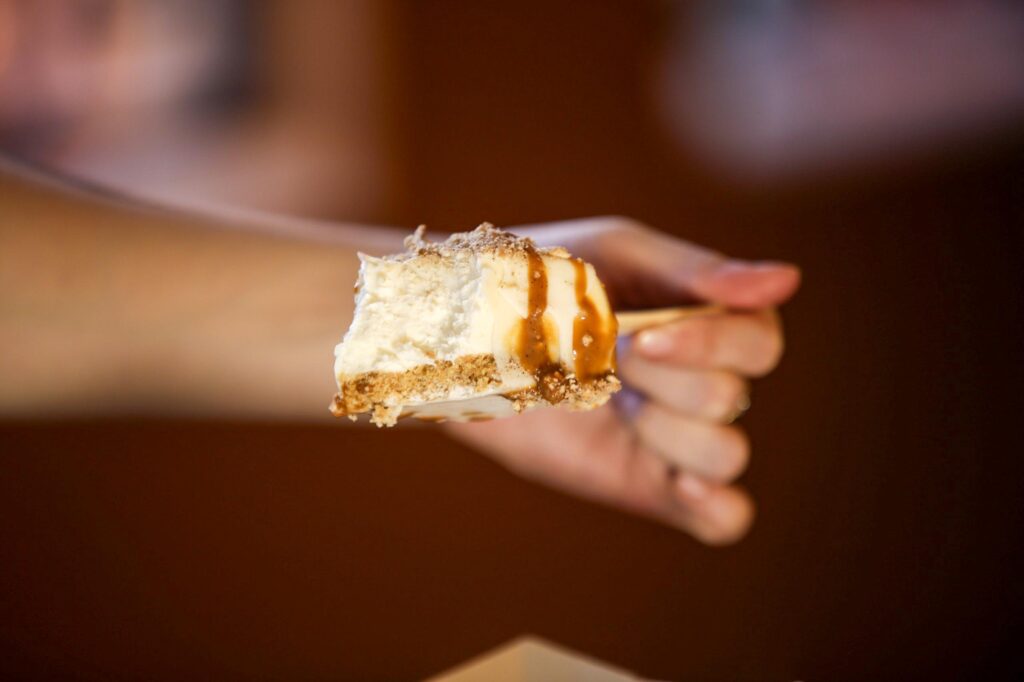 Maricruz explicó que la pastelita consiste en un cheesecake cubierto con una base de chocolate, la cual puede elegirse entre chocolate oscuro o chocolate blanco con los topping que el cliente desee.
