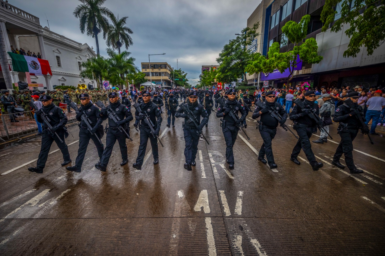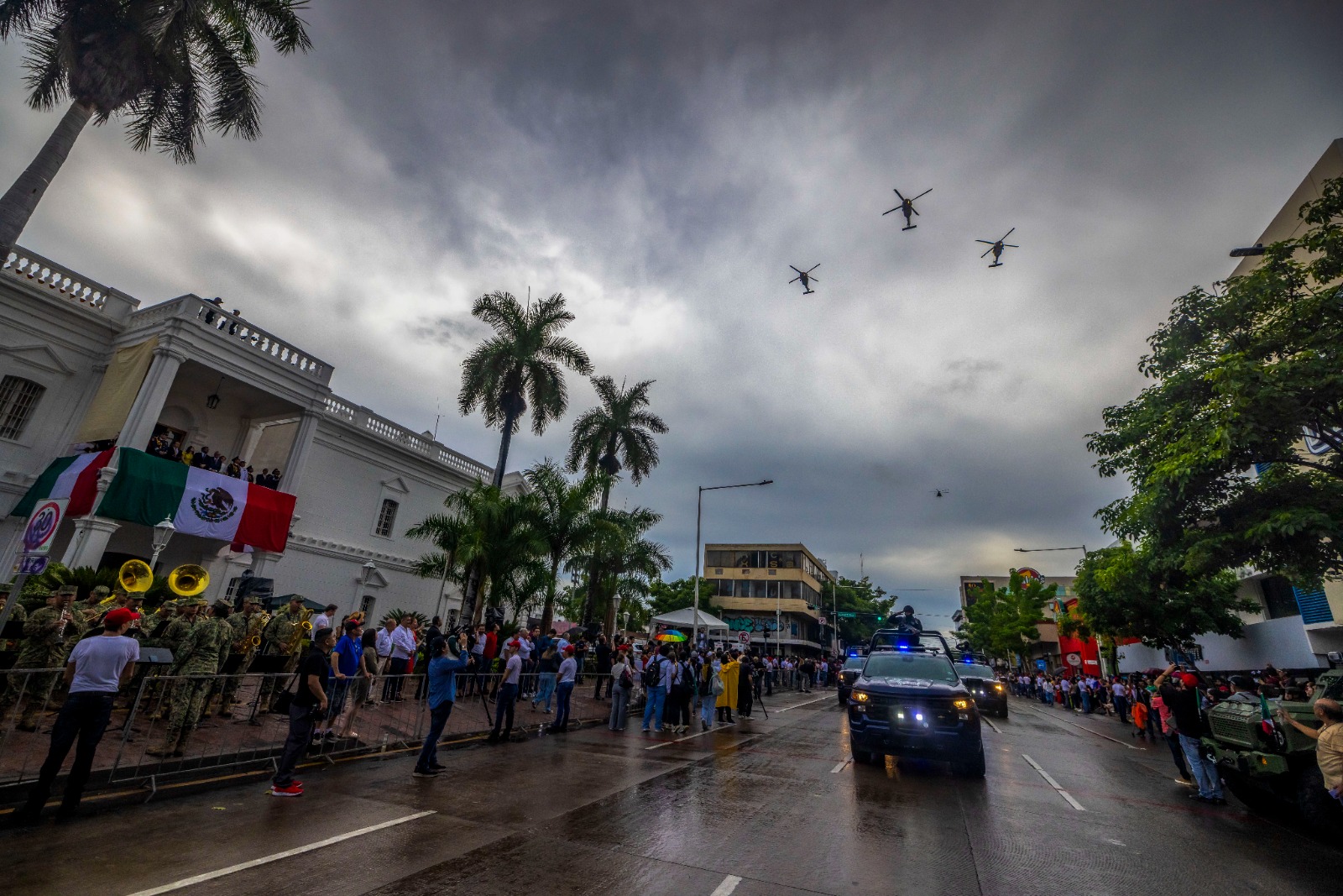 El mandatario estatal fue recibido en el edificio del Ayuntamiento, por el alcalde Juan de Dios Gámez Mendívil, para presenciar el desfile, que contó con la participación de 1,185 militares y 120 oficiales de la PEP, efectivos del Ejército, Fuerza Aérea, Marina Armada de México, Guardia Nacional, Policía estatales y municipales.