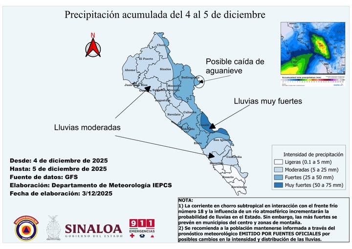 Además, se mantienen las condiciones para la posible caída de aguanieve en zonas de montaña del municipio de Badiraguato, particularmente en áreas que colindan con el estado de Chihuahua, donde el descenso de temperaturas será más marcado.