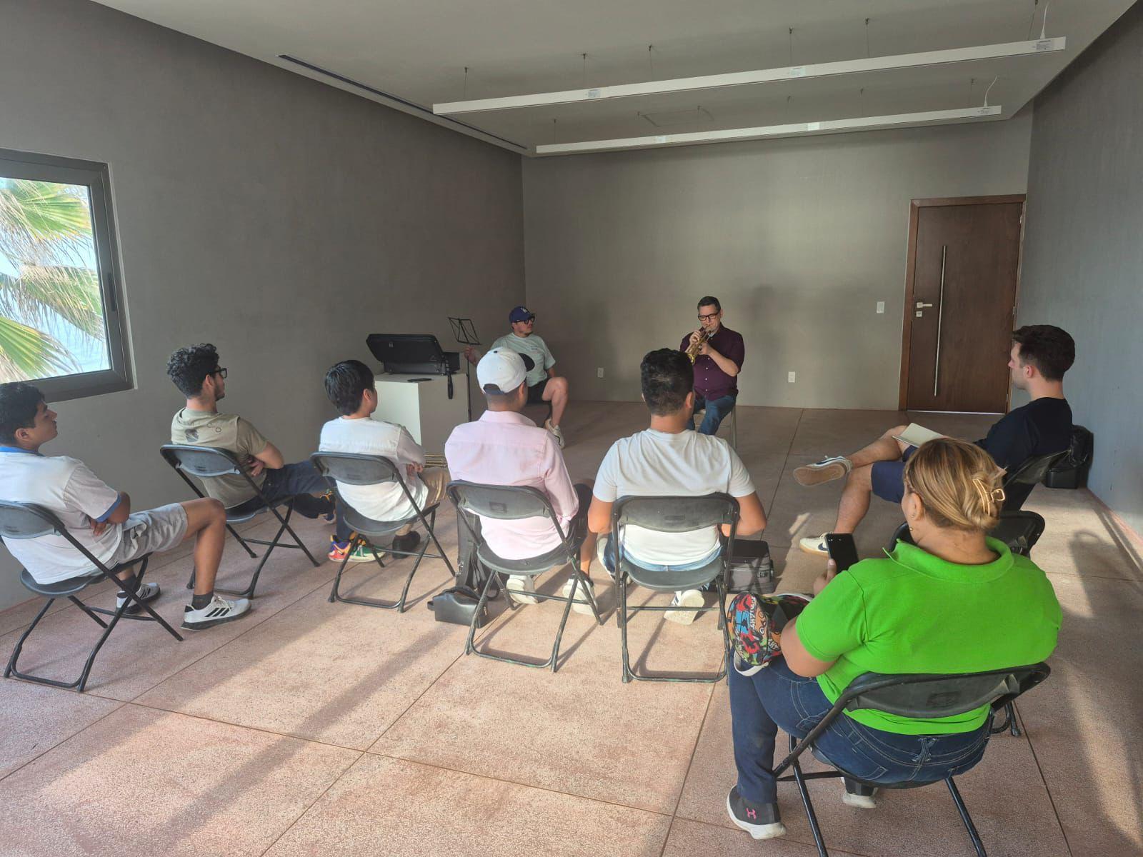 Mazatlán, Sinaloa, 15 de noviembre de 2025- La tarde del viernes, el Museo Casa del Marino se llenó de luz, brisa marina y un ambiente de total concentración, frente a un pequeño grupo de estudiantes, Rex Richardson tomó asiento, trompeta en mano, para ofrecer una masterclass que más que una clase sobre técnica, fue una conversación cercana, honesta y llena de humanidad.
