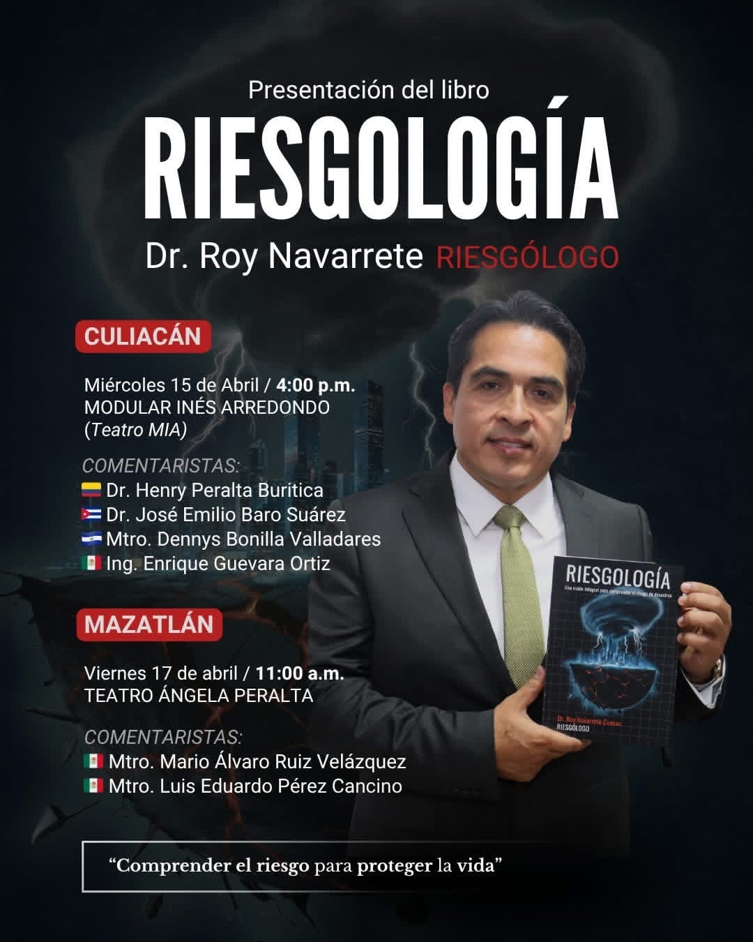 Para presentar este libro acompañarán al autor los maestros Mario Ruiz Velázquez y Luis Eduardo Pérez Ortiz Cancino, expertos en la materia con más de 30 años trabajando en el tema de riegos, ambos son de origen mexicano, también estará el maestro Dennis Bonilla Valladares, originario de El Salvador.