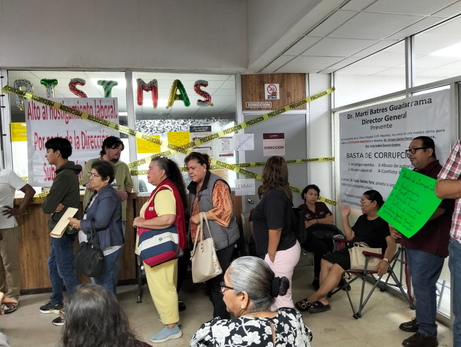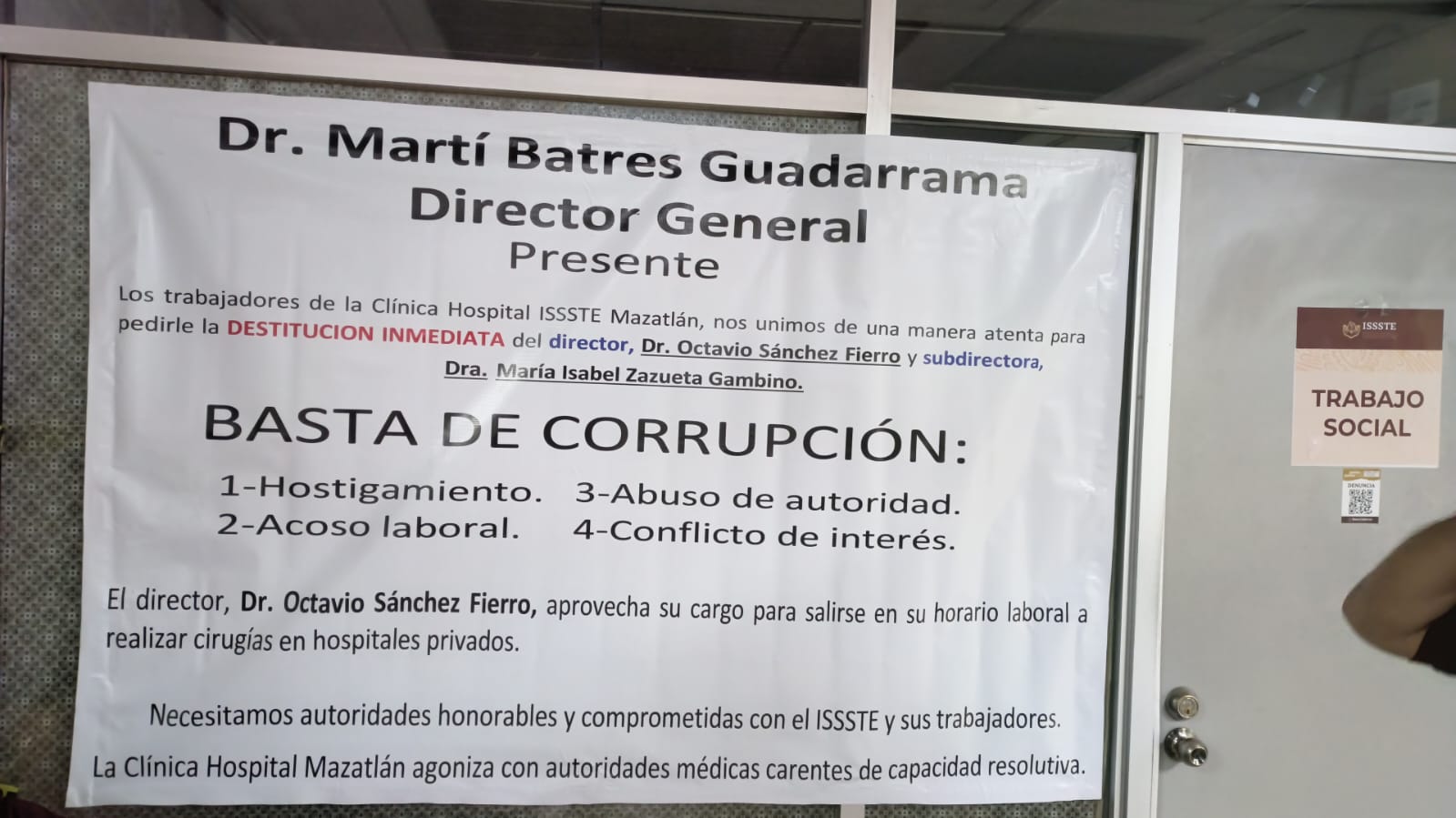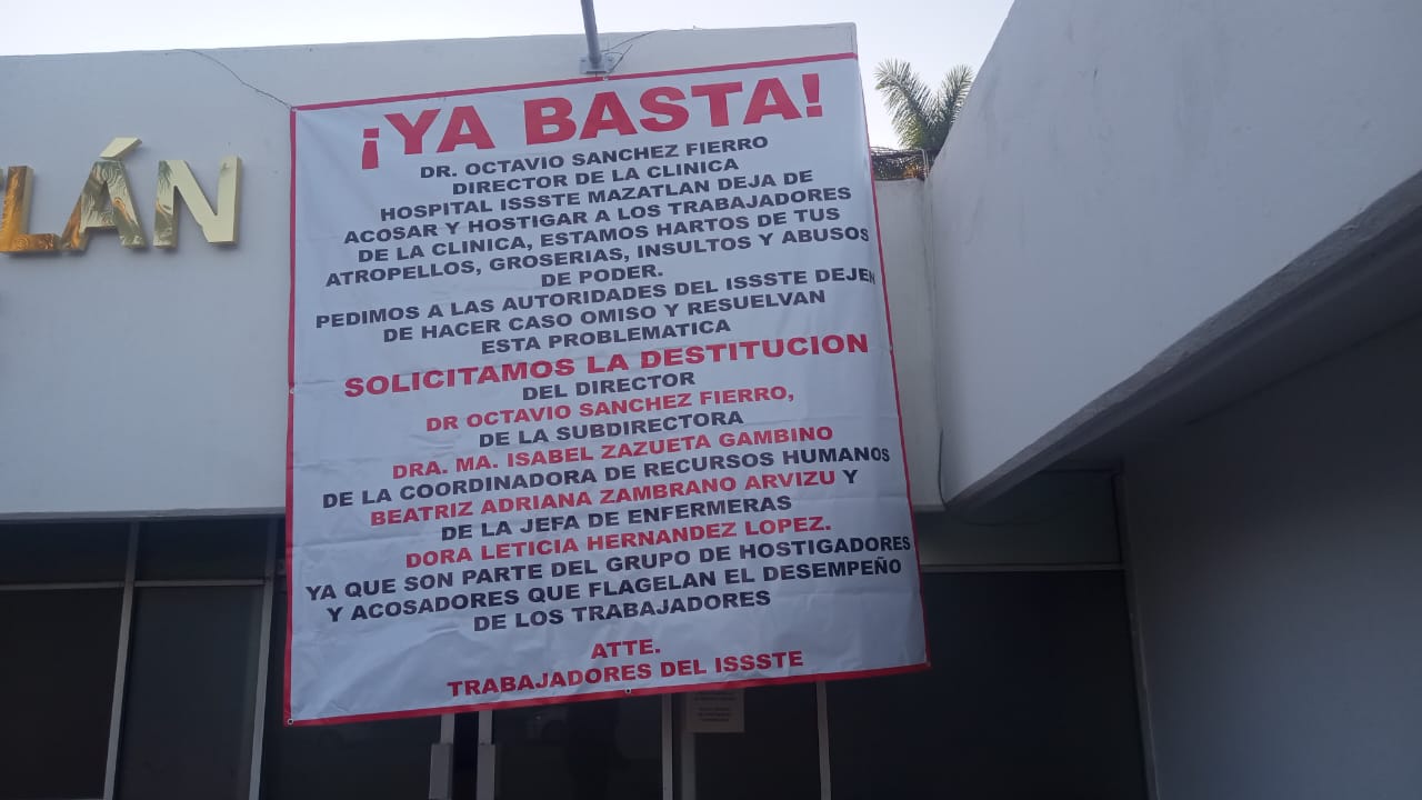 Empleados administrativos y personal médico del Hospital del ISSSTE en Mazatlán realizan una protesta al interior de la institución para exigir la destitución del director, Dr. Octavio Sánchez Fierro, y de la subdirectora, María Isabel Zazueta Gambino.