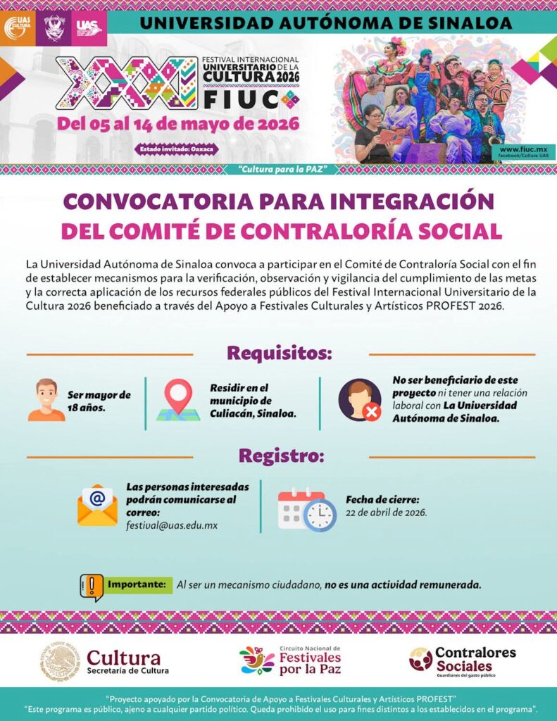 En su compromiso con la transparencia y la rendición de cuentas en el ejercicio de los recursos públicos, la Universidad Autónoma de Sinaloa (UAS), a través de la Dirección General de Extensión de la Cultura, hace un llamado a la sociedad sinaloense para participar en la integración del Comité de Contraloría Social para el Festival Internacional Universitario de la Cultura (FIUC) 2026.