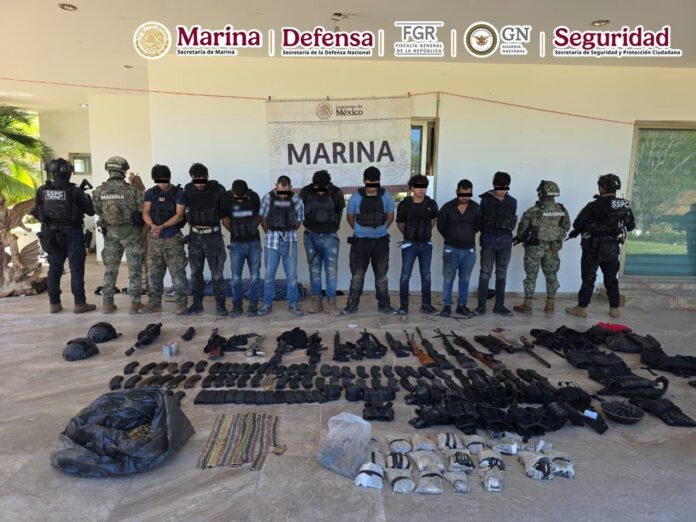 Resultado de los trabajos de reforzamiento de seguridad en el estado de Sinaloa, elementos de la Secretaría de Marina (Semar) a través de la Armada de México, junto con Secretaría de la Defensa Nacional (Defensa), Fiscalía General de la República (FGR), Guardia Nacional (GN) y Secretaría de Seguridad y Protección Ciudadana (SSPC), detuvieron a nueve personas, aseguraron armamento, municiones y vehículos.